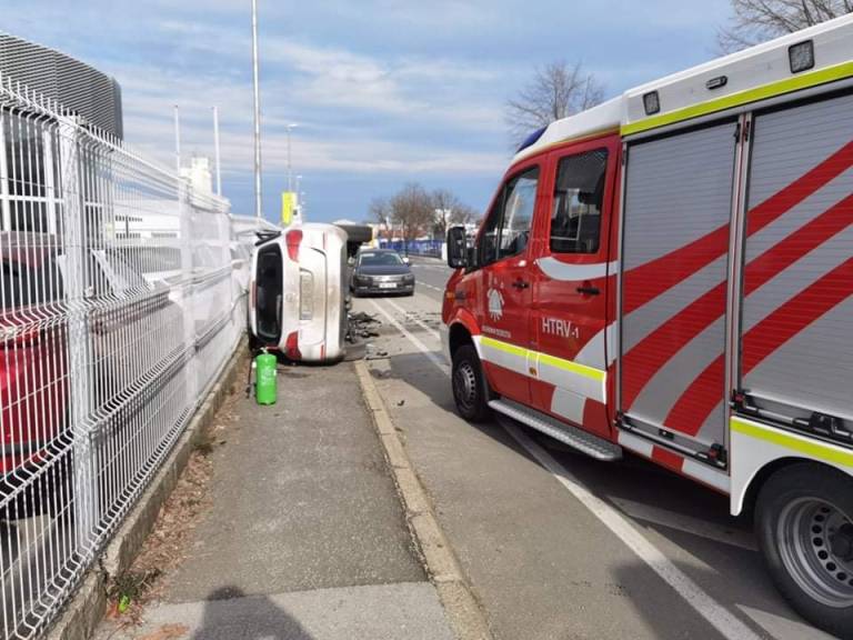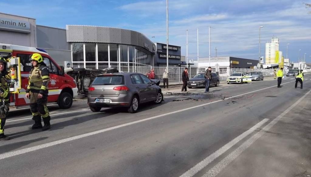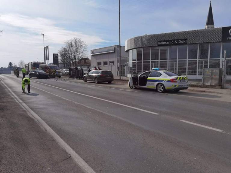 Po poročanju Uprave za zaščito in reševanje Republike Slovenije sta ob 12.18 trčili osebni vozili. Pri tem se je eno vozilo prevrnilo na bok, poškodovale so se štiri osebe.