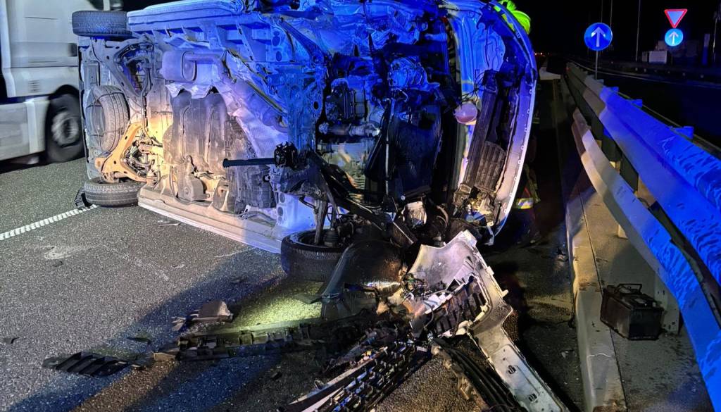 Vozilo se je zaletelo v zaščitno ograjo in se prevrnilo na bok.