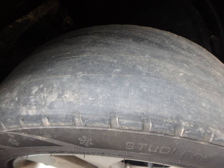 Pri pregledu tehnične brezhibnosti osebnega avtomobila pa so policisti ugotovili, da prednji pnevmatiki nista izpolnjevali predpisanih zahtev za uporabo v cestnem prometu, saj sta bili po celotni tekalni površini obrabljeni tako močno, da je bila vidna celo podloga iz tkanine tako imenovane »karkasa«.