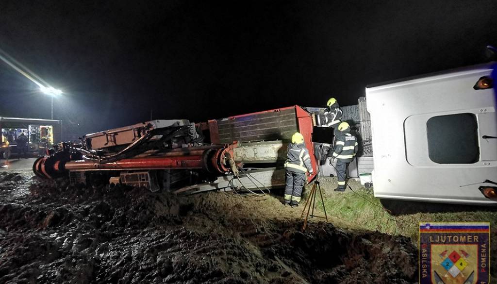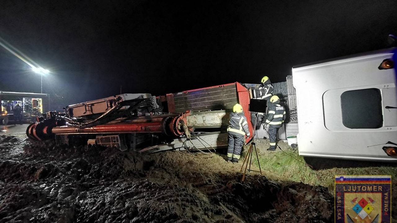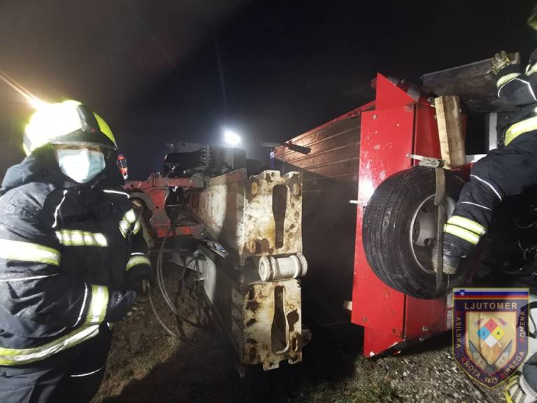 Ormoški in ljutomerski gasilci so pri prometni nesreči posredovali včeraj ob 18.00, ko se je prevrnil tovornjak z delovnim strojem. Iz tovornjaka je iztekalo pogonsko gorivo, iz delovnega stroja pa hidravlično olje.