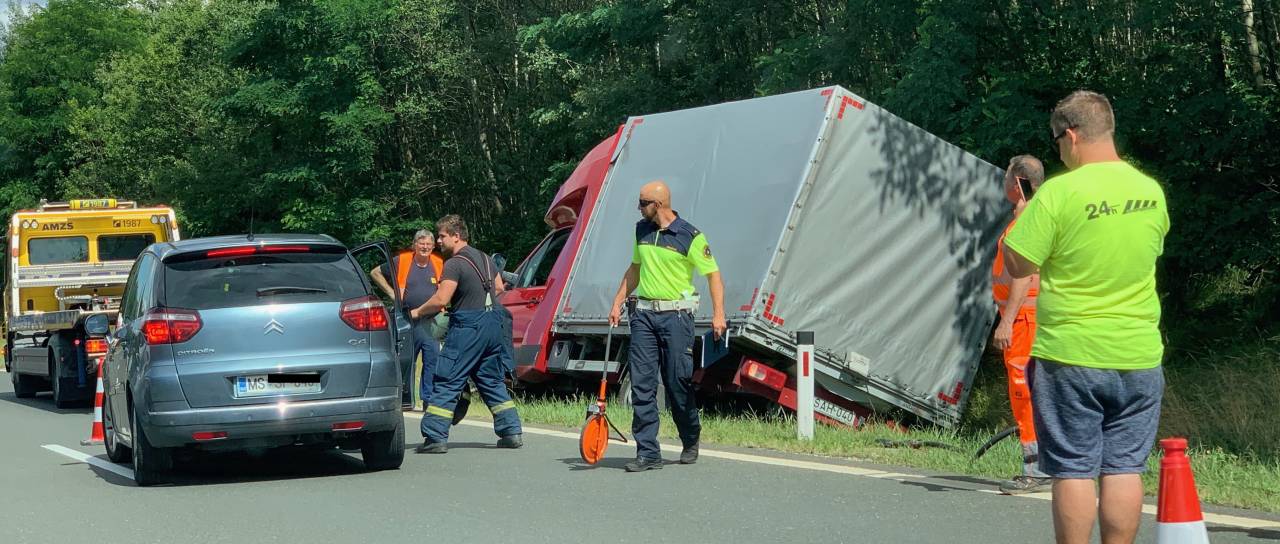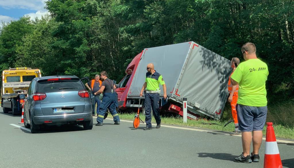 Po informacijah bralcev Sobotainfo je tovorno vozilo tujih registrskih oznak pristalo na boku zunaj vozišča. Vzrok nesreče še ni znan.