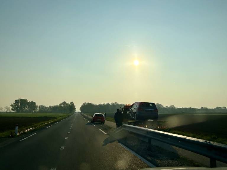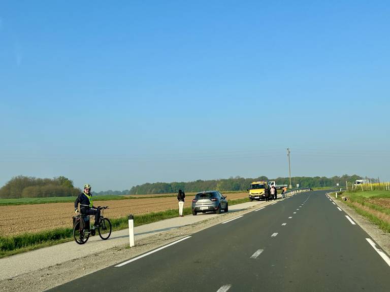 Danes ob 5.31 je na regionalni cesti Beltinci - Lipa v občini Beltinci osebno vozilo zapeljalo s cestišča in pristalo na strehi na kolesarski stezi.