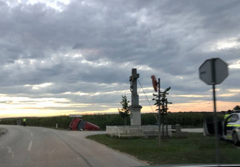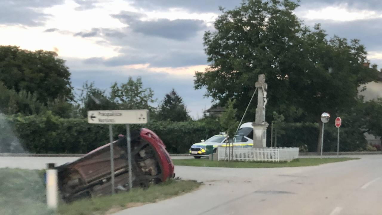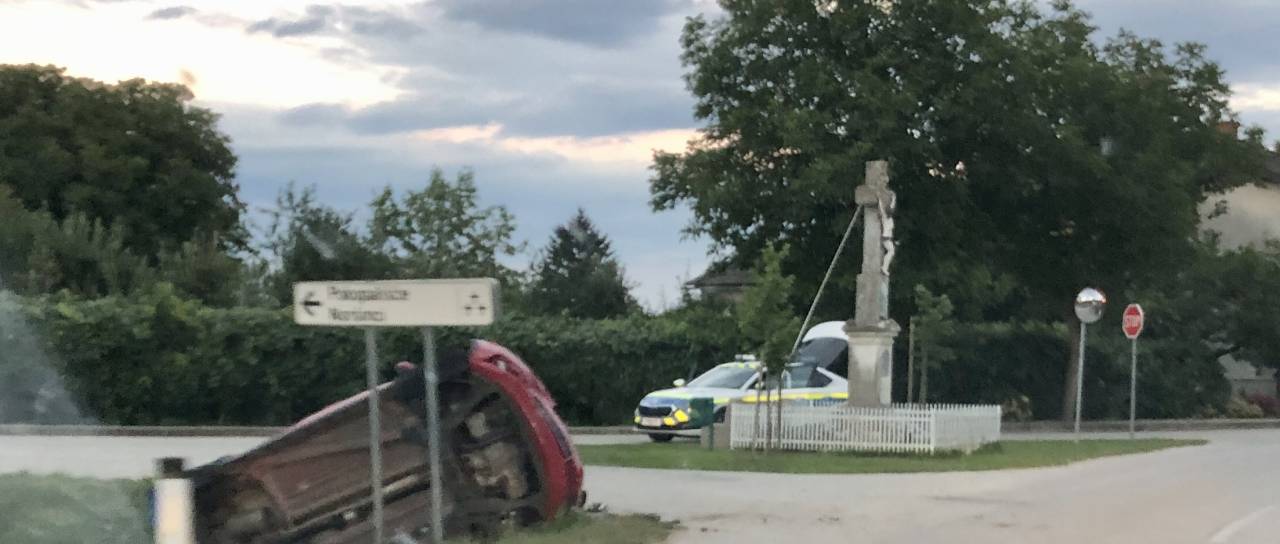 V Moravskih Toplicah je prišlo do prometne nesreče, v kateri je avto v križišču zletel s ceste in se prevrnil na bok.