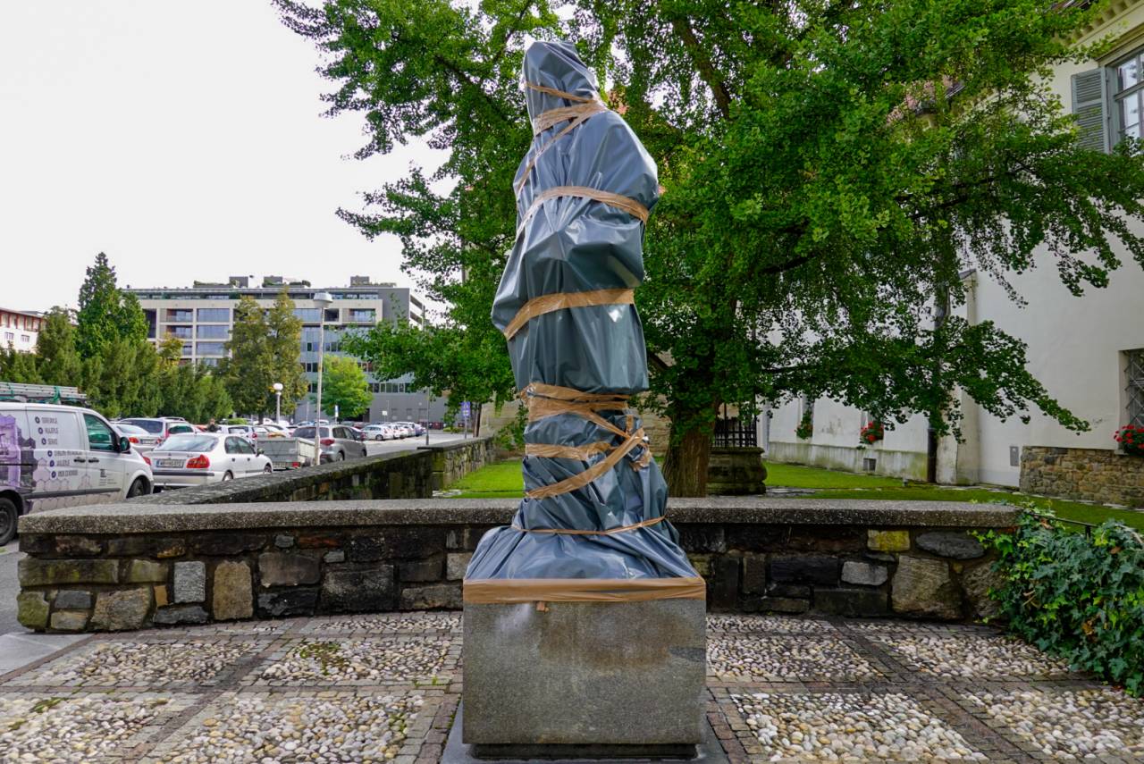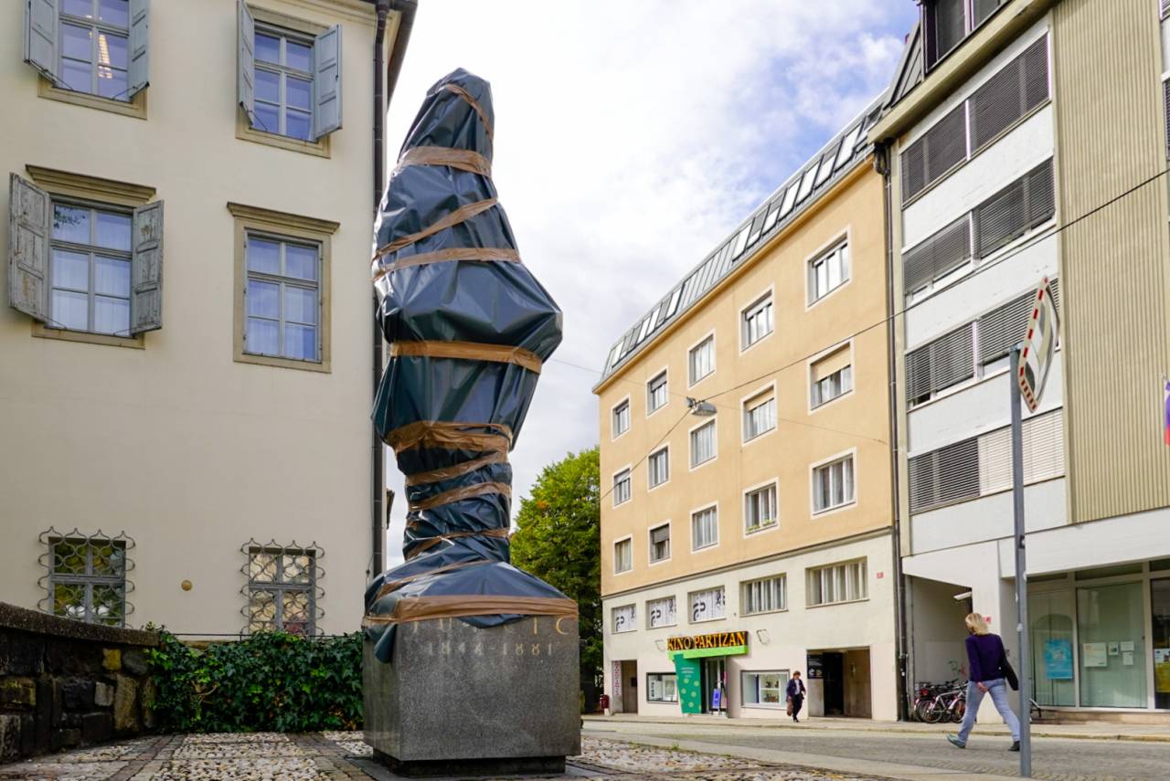 Ste tudi vi ob sprehodu skozi središče Maribora na Trgu generala Maistra opazili v polivinil ovito strukturo? Tukaj je še včeraj stal spomenik Josipu Jurčiču, ki so ga neznanci najverjetneje ponoči poškodovali oziroma posprejali z različnimi barvami.