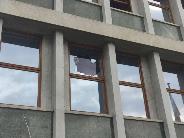 Parlament ima danes razbita okna, smetnjaki ob njem so zašgani, stavba pa je tudi rahlo okrušena. Steklo je še vedno na tleh, pred poškodovanimi deli stavbi pa so napeljali varnostni trak.