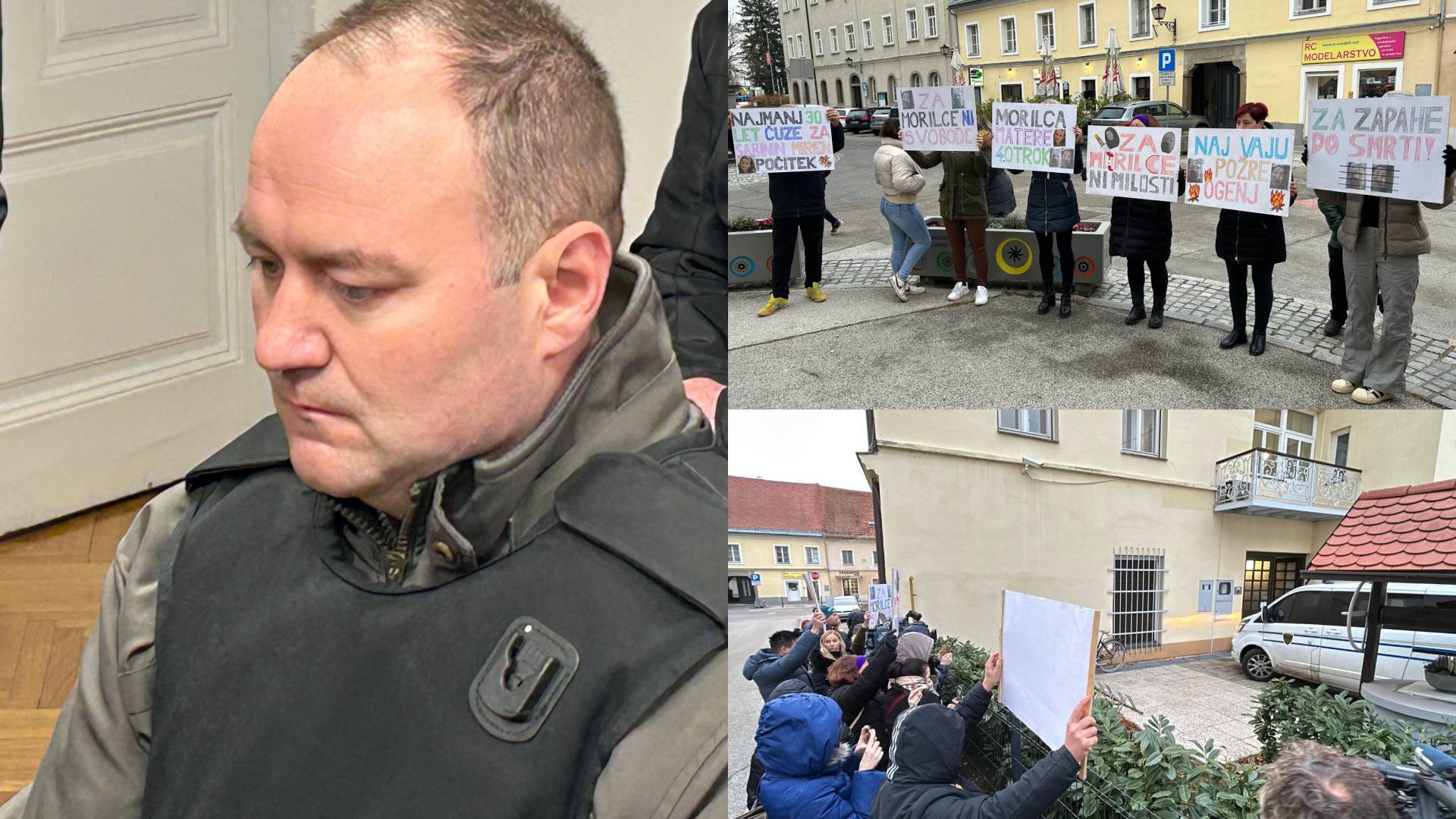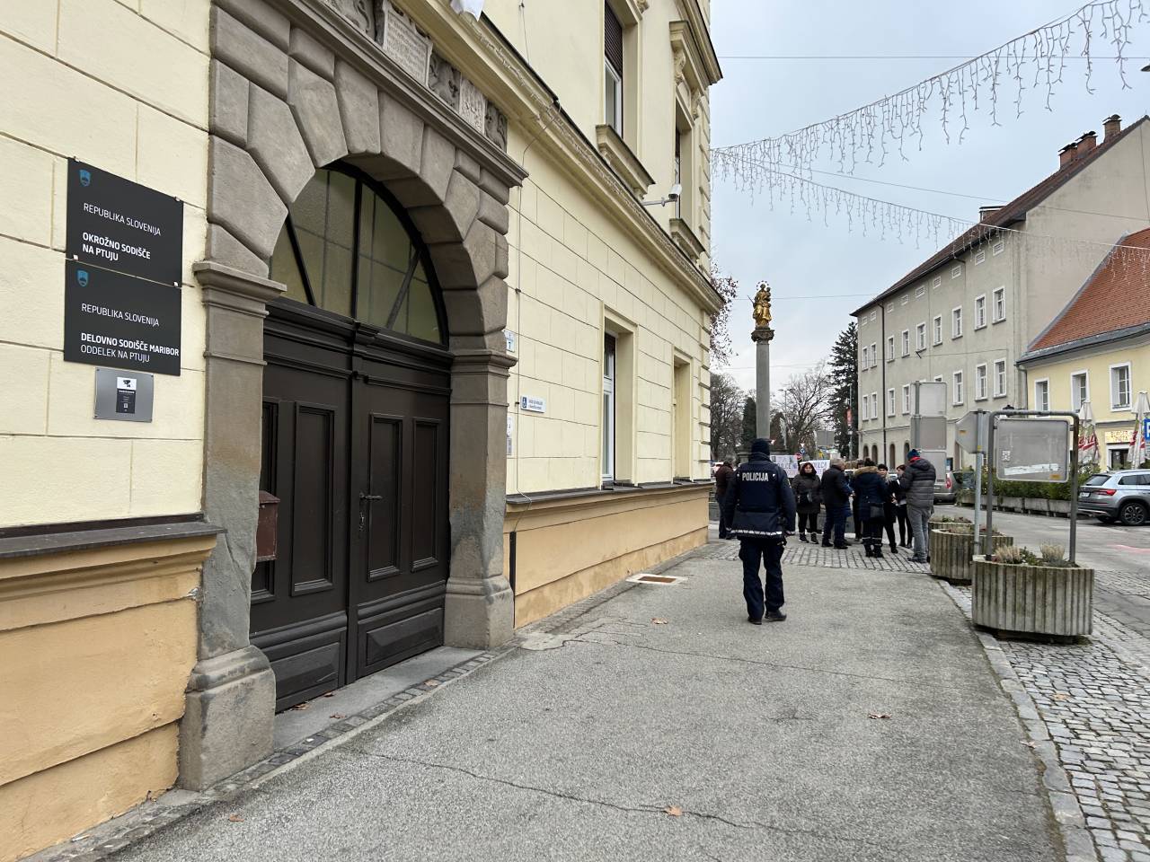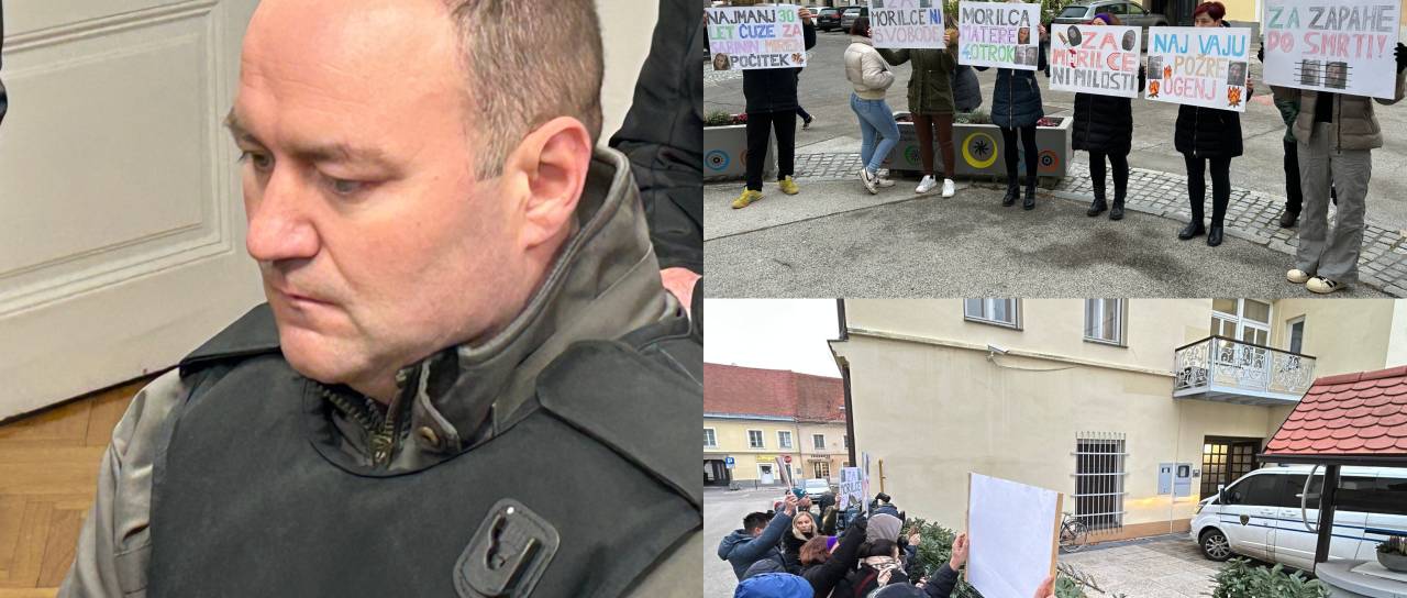 Pred ptujskim sodiščem se zbirajo znanci in prijatelji preminule, s sabo imajo transparente. Na transparentih lahko preberemo napise, kot so: »Za zapahe do smrti« in »Naj vaju ogenj požre«.