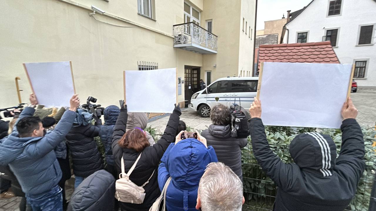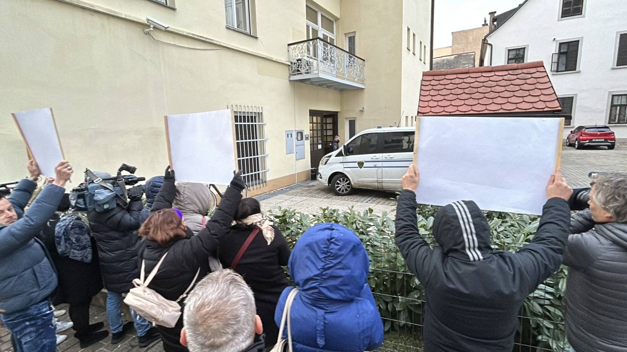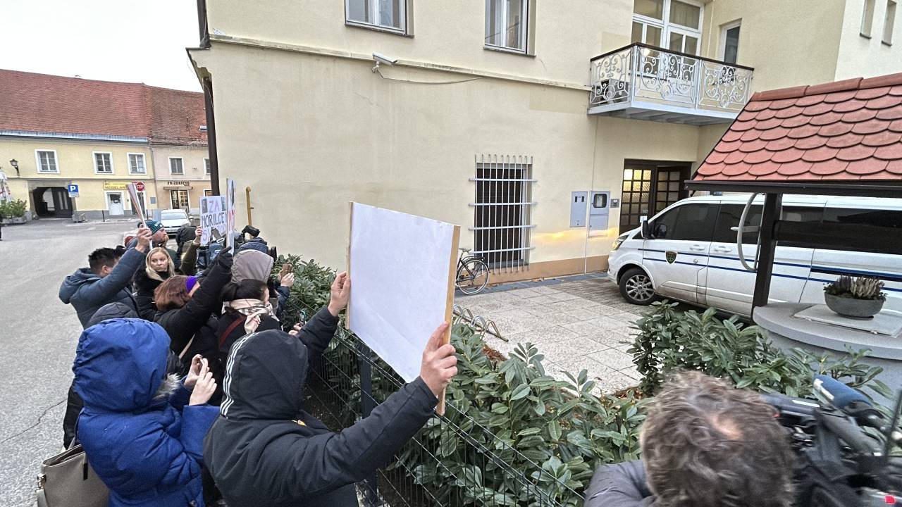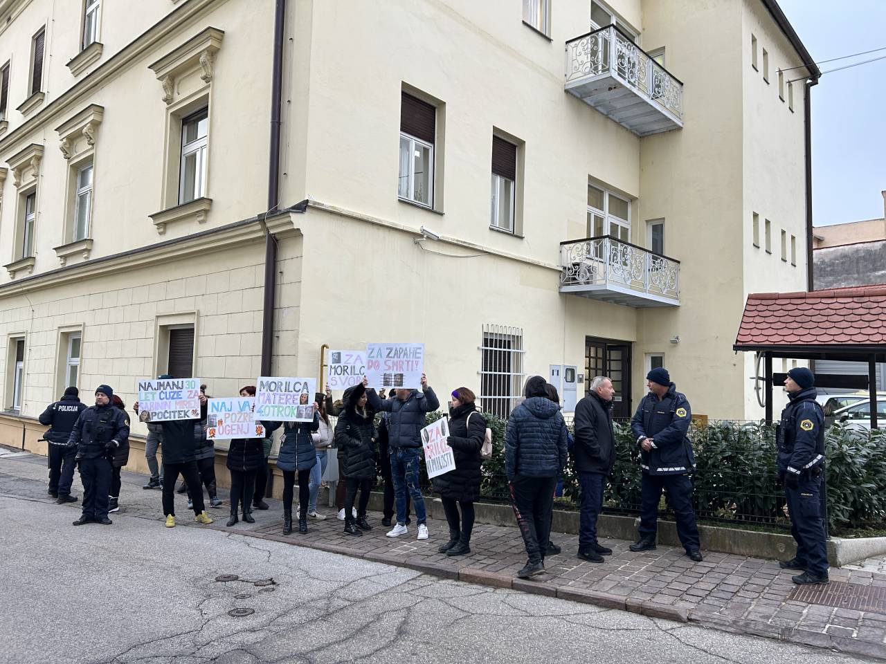 Pred ptujskim sodiščem se zbirajo znanci in prijatelji preminule, s sabo imajo transparente. Na transparentih lahko preberemo napise, kot so: »Za zapahe do smrti« in »Naj vaju ogenj požre«.