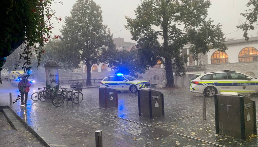 Nekaj po 10. uri dopoldne smo na Petkovškovem nabrežju v središču Ljubljane opazili modre pobliske policijskih luči. V ozadju se je gnetlo tudi vozilo gasilcev, ki se je odpeljalo ravno, ko je sivina neba iz sebe iztisnila silovit naliv.