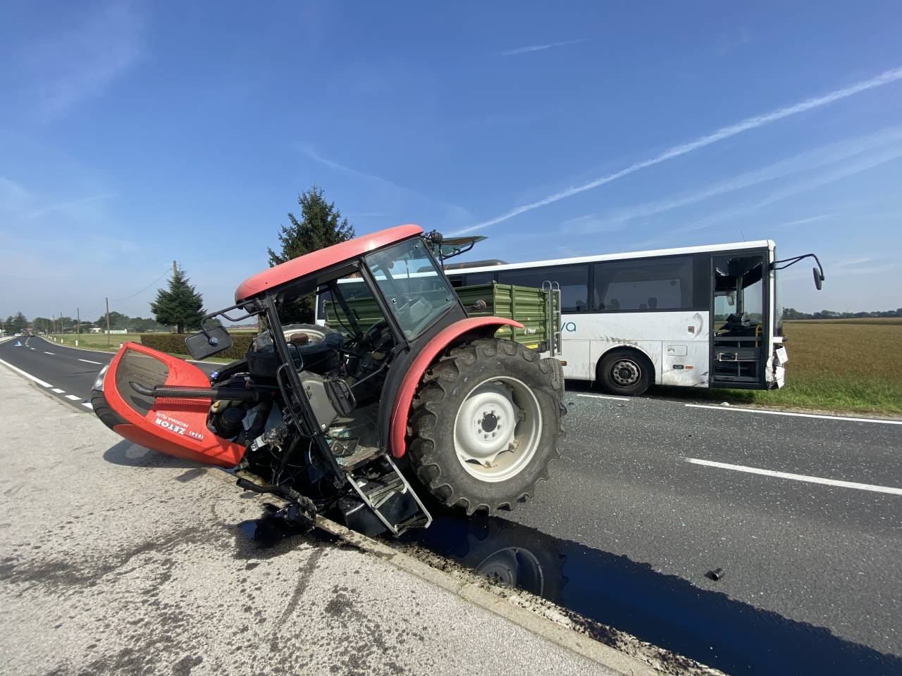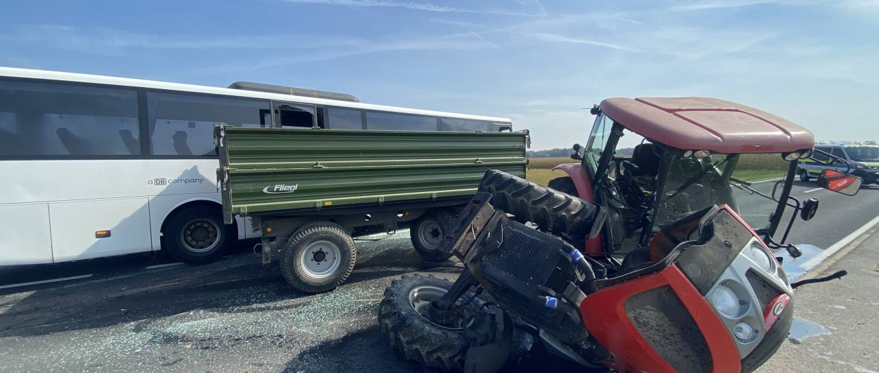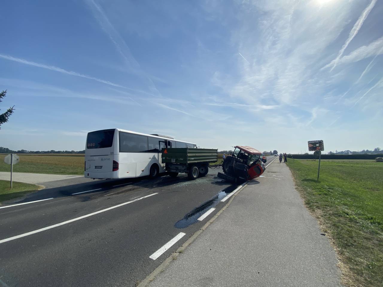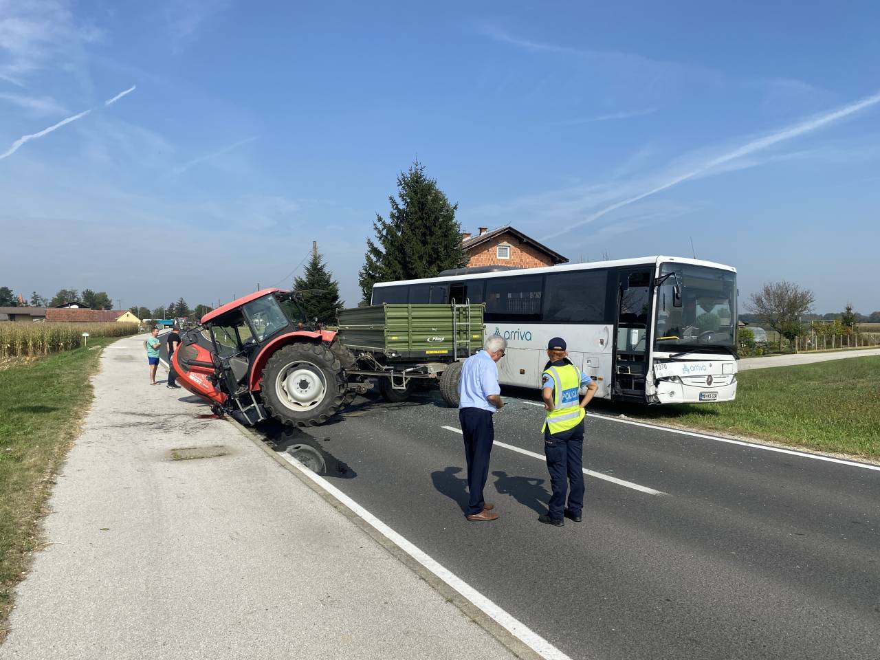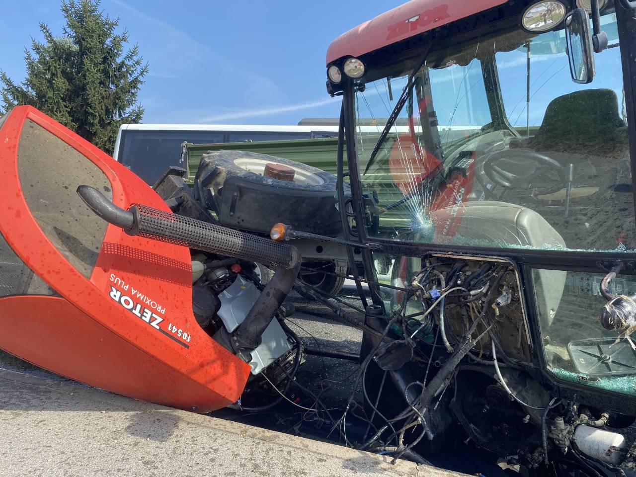 In sicer - kot je razvidno iz fotografij - sta trčila traktor in avtobus.