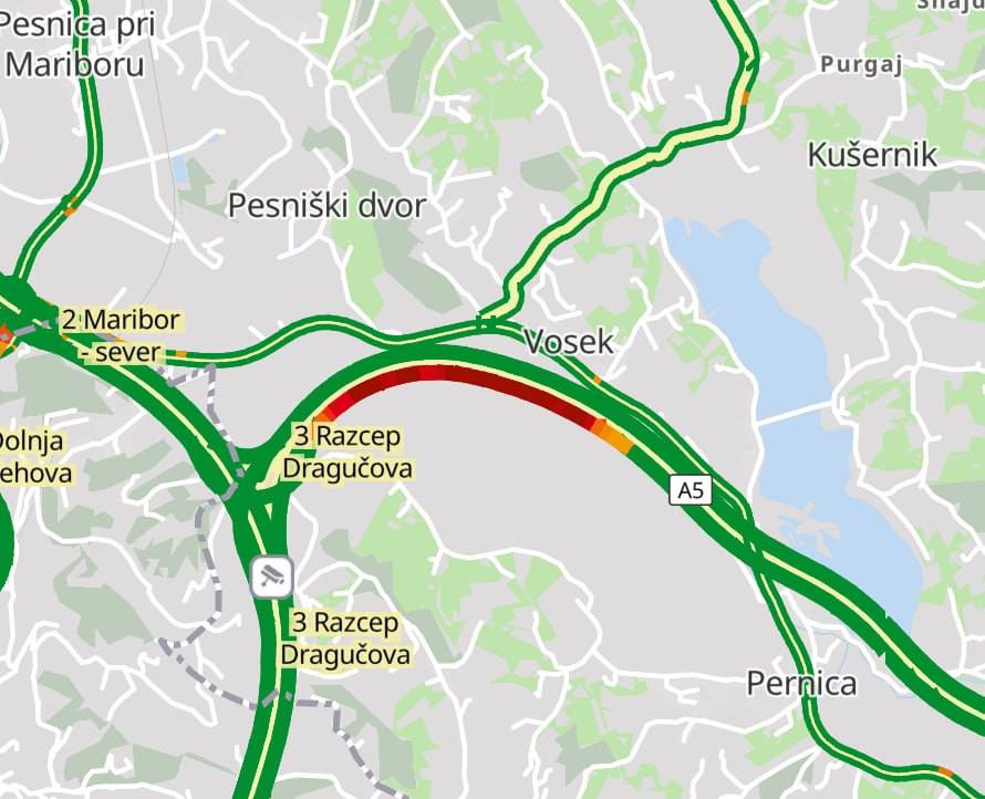 Po poročanju prometno informacijskega centra za ceste je med Dragučovo in Pernico proti Murski Soboti zaprt vozni pas.
