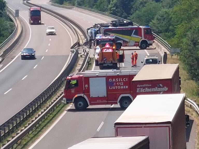 Tovorno vozilo, ki je prevažalo osebne avtomobile, se je prevrnilo in zagorelo, avtocesta je zato med priključkoma Vučja vas in Sveti Jurij ob Ščavnici proti Mariboru popolnoma zaprta.