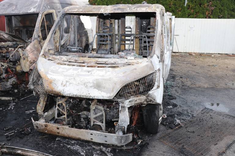 Nato je pristopil do tam parkiranega specialnega vozila policije, kjer je v notranjost odvrgel neznano eksplozivno sredstvo, kar je povzročilo eksplozijo in požar, v katerem so v celoti zagorela tri tovorna vozila, medtem ko sta bila osebno vozilo in tam postavljen ladijski kontejner močno poškodovana.