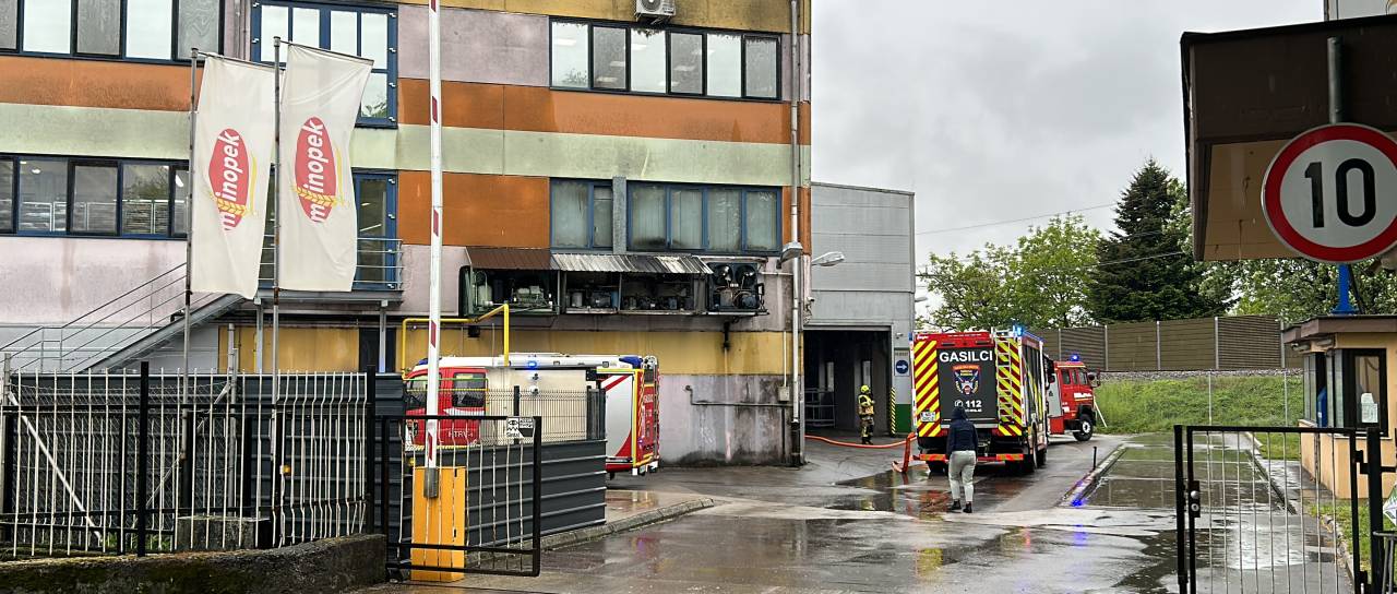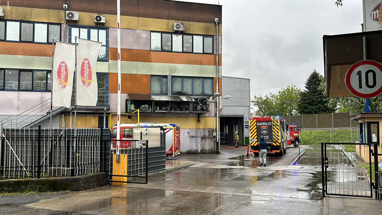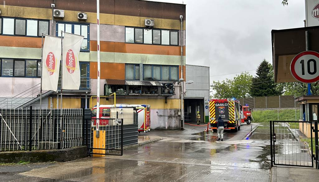 Gasilci posredujejo v prostorih Mlinopeka. Na terenu je več gasilskih vozil, v okolici intervencije se širita smrad in dim.