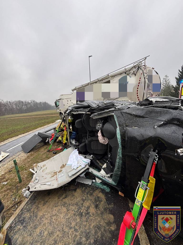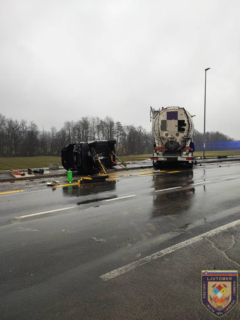 Prometna nesreča v Radomerju, osebno vozilo pristalo na boku.