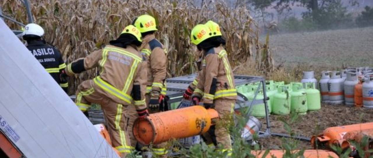 Pripadniki gasilske enote so v prometni nesreči prevrnjene plinske jeklenke umaknili na varno.