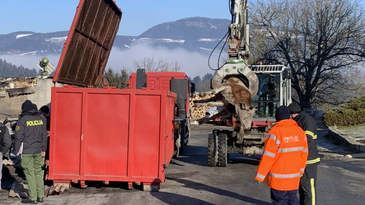 Dan po uničujočem požaru v Šentjanžu nad Dravčami se za življenje bori še zadnja krava, a upanja, da bi preživela, je malo. Večina živali je poginila ob izbruhu požara, danes so zaradi vdihanega dima poginile še preostale živali.