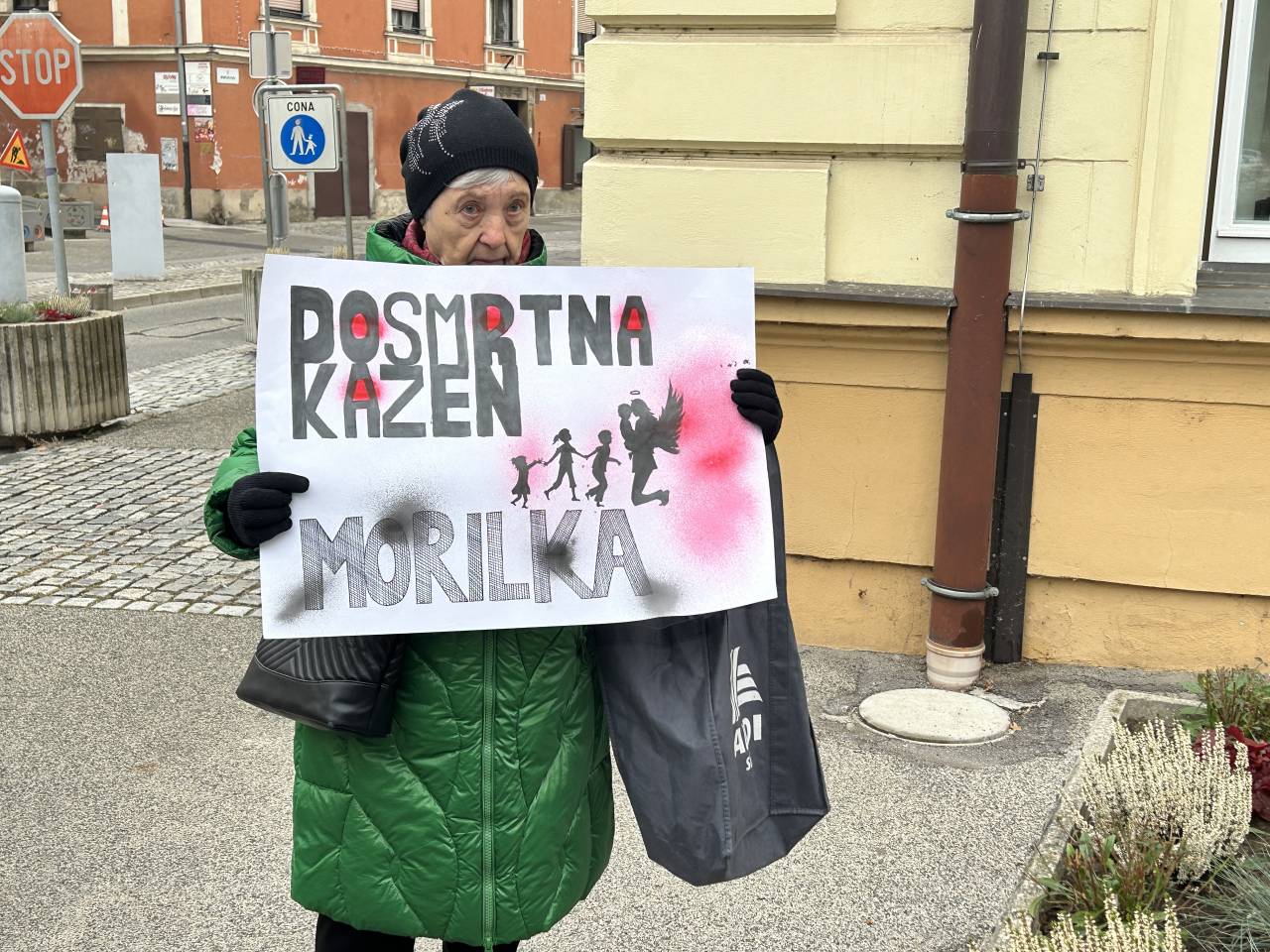 Pred sodiščem je bila tudi starejša gospa s transparentom, na katerem je pozivala k dosmrtni kazni in zapisom morilka.