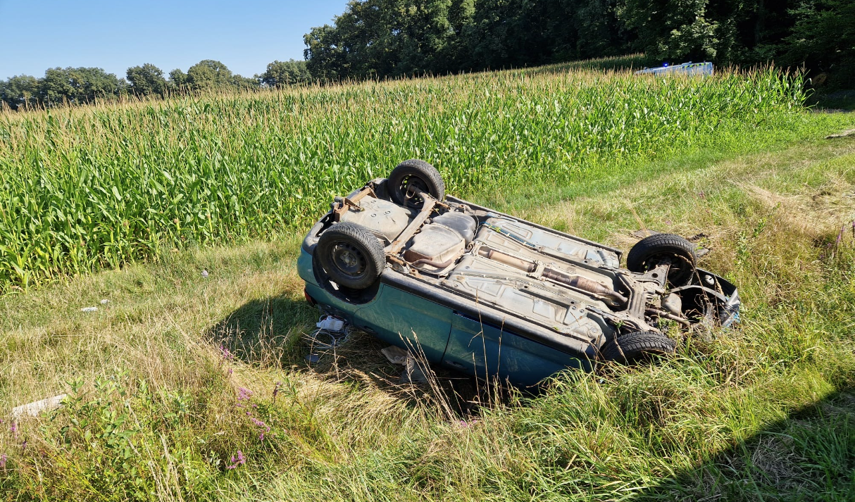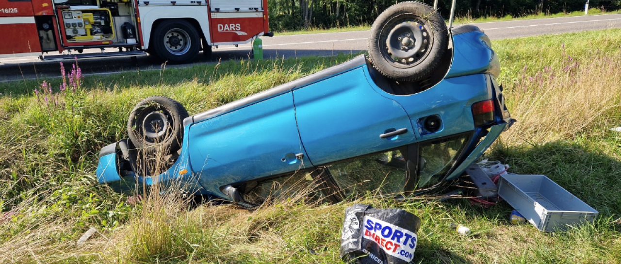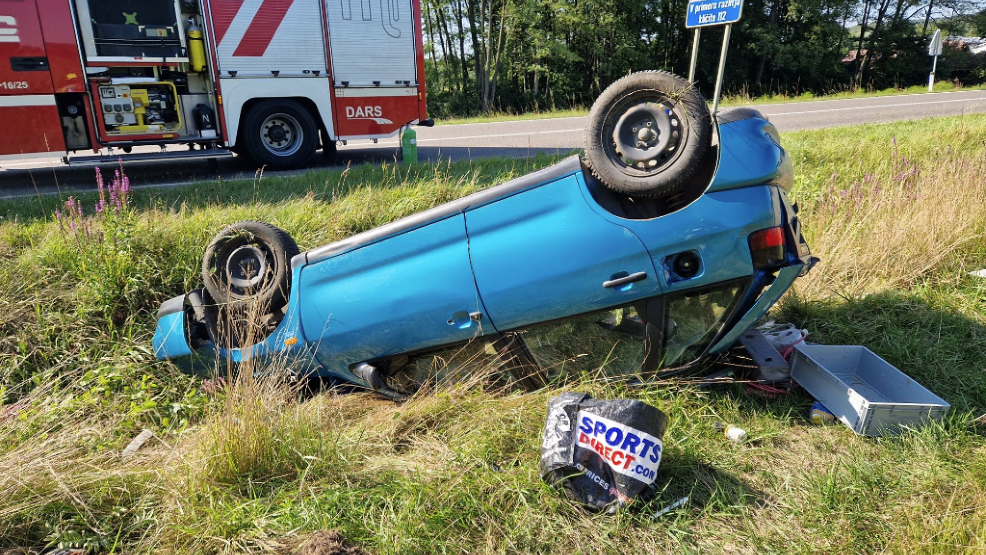 Voznik je zapeljal izven vozišča, avtomobil je obrnilo na streho.