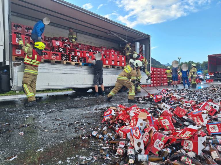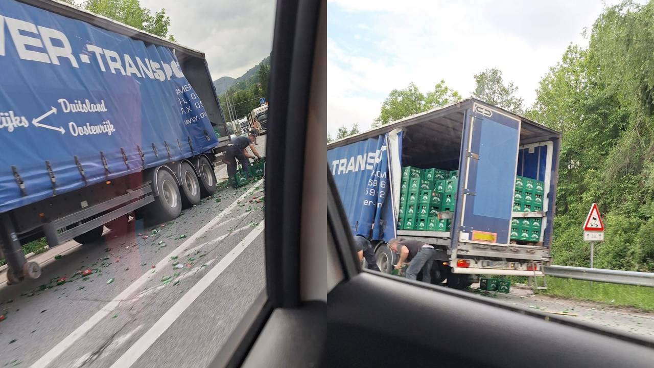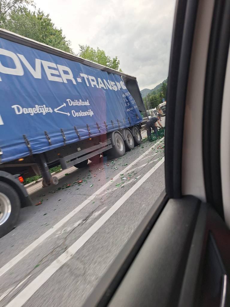 Tovornjaku se je med vožnjo odprla leva stranica na prikolici, več tisoč steklenic piva je zletelo na cesto.