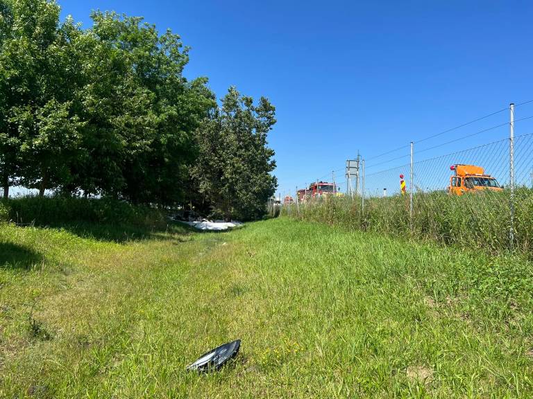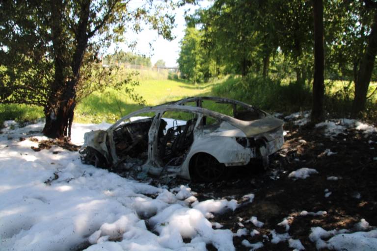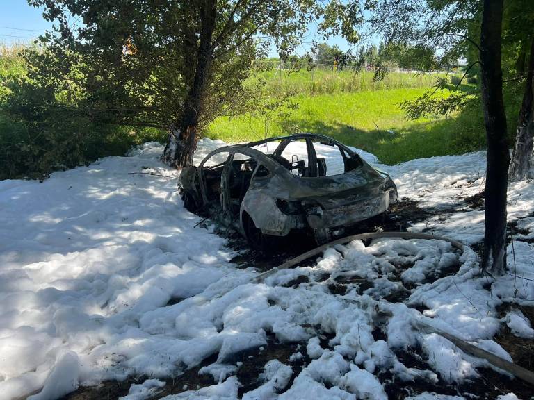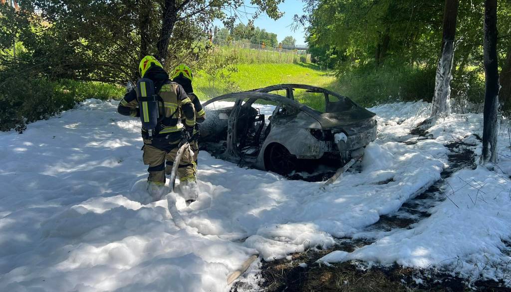 Osebni avtomobil znamke Tesla se je zaradi trčenja vžgal in je v celoti zgorel. Voznik je bil lahko telesno poškodovan.