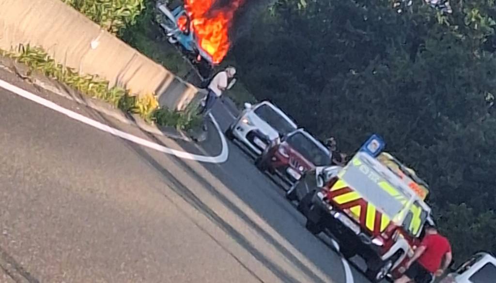 Ob 7.10 sta trčili osebni vozili in kombinirano vozilo, ki je zagorelo.