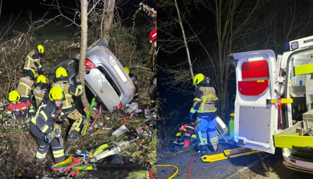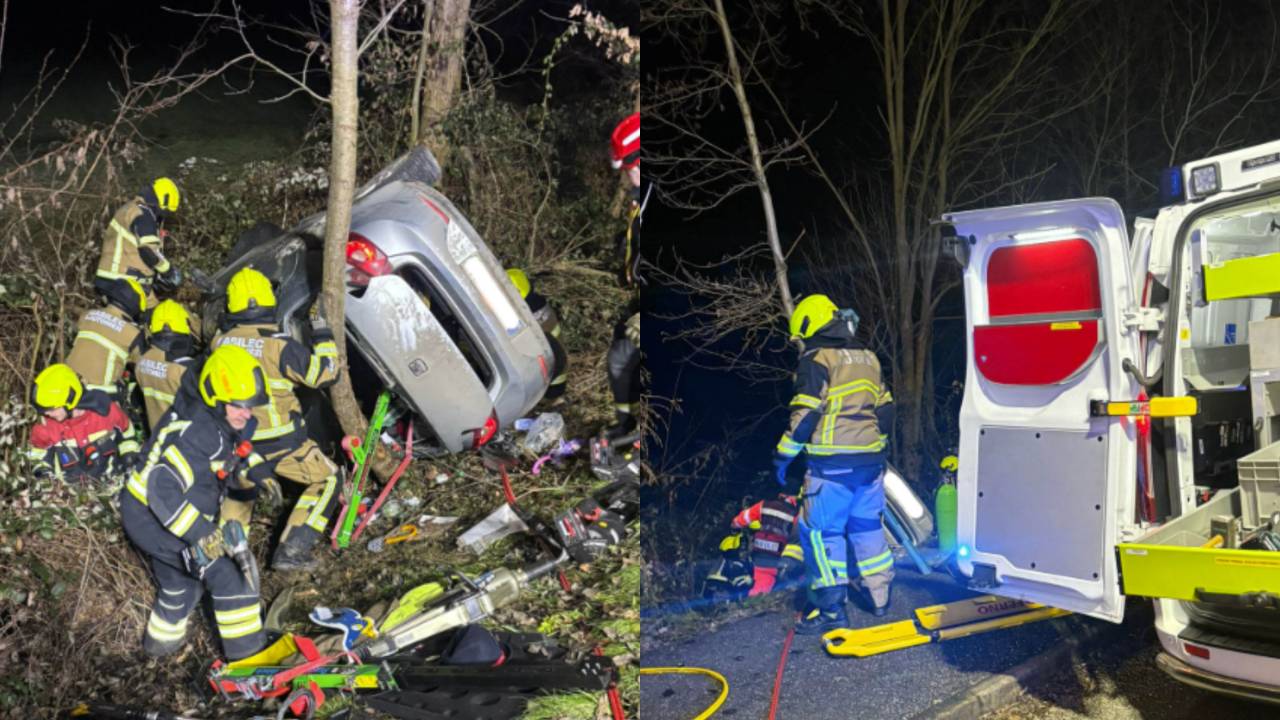 V vozilu je ostala ukleščena in poškodovana oseba, gasilci pa so morali pri reševanju podreti tudi nekaj dreves.
