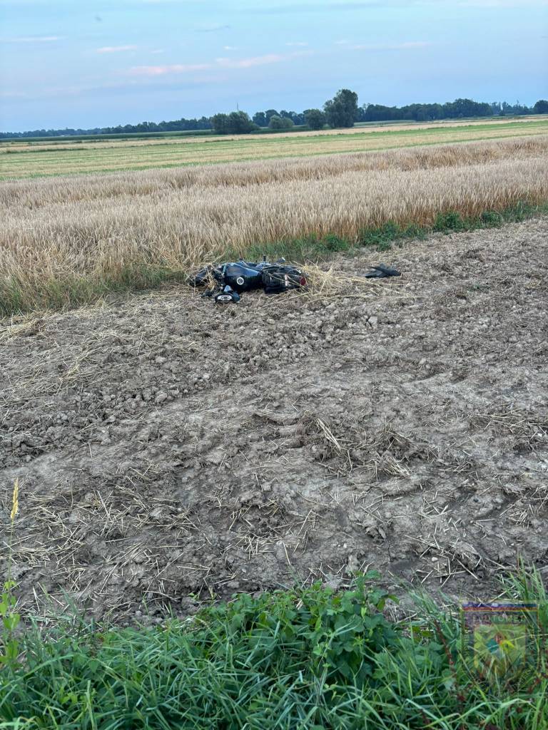 Policisti so ugotovili, da je motorist zaradi neprilagojene hitrosti v blagem desnem ovinku zapeljal izven vozišča na njivo in padel.
