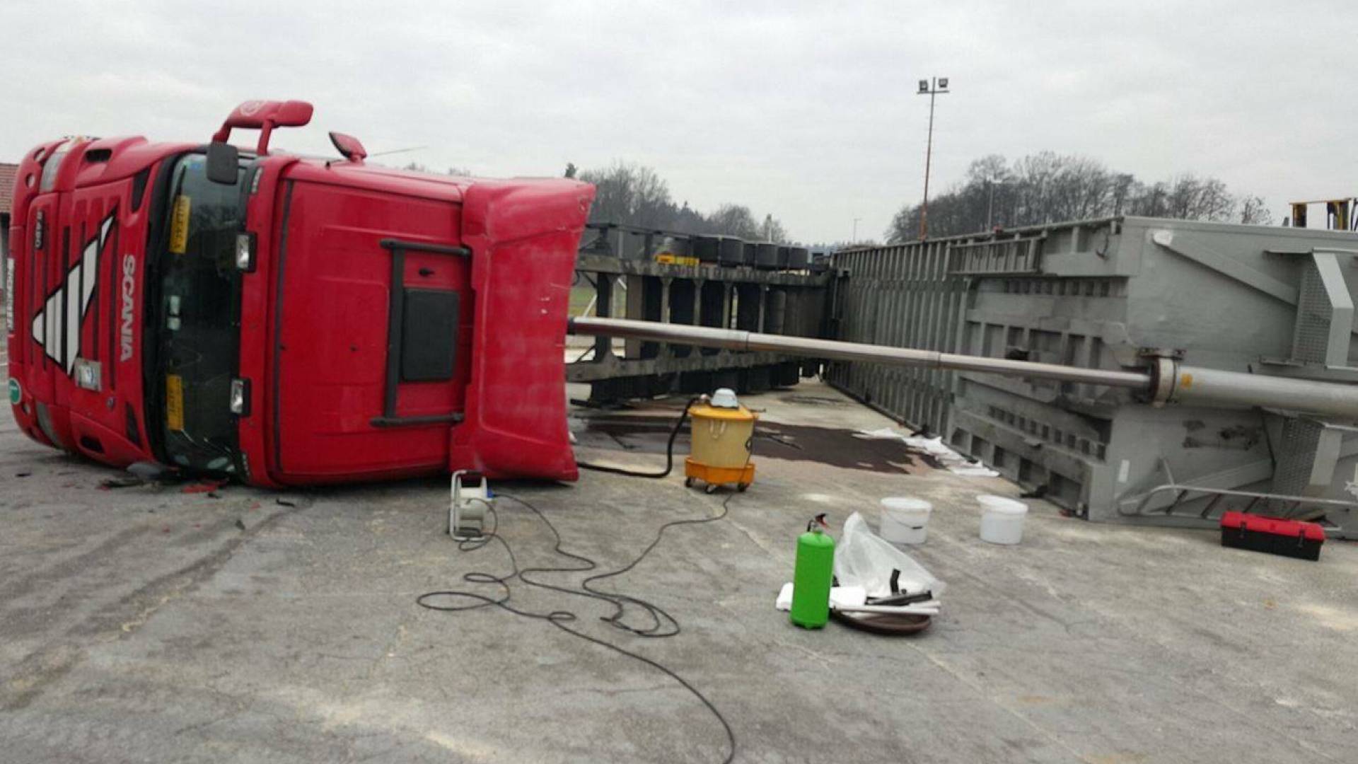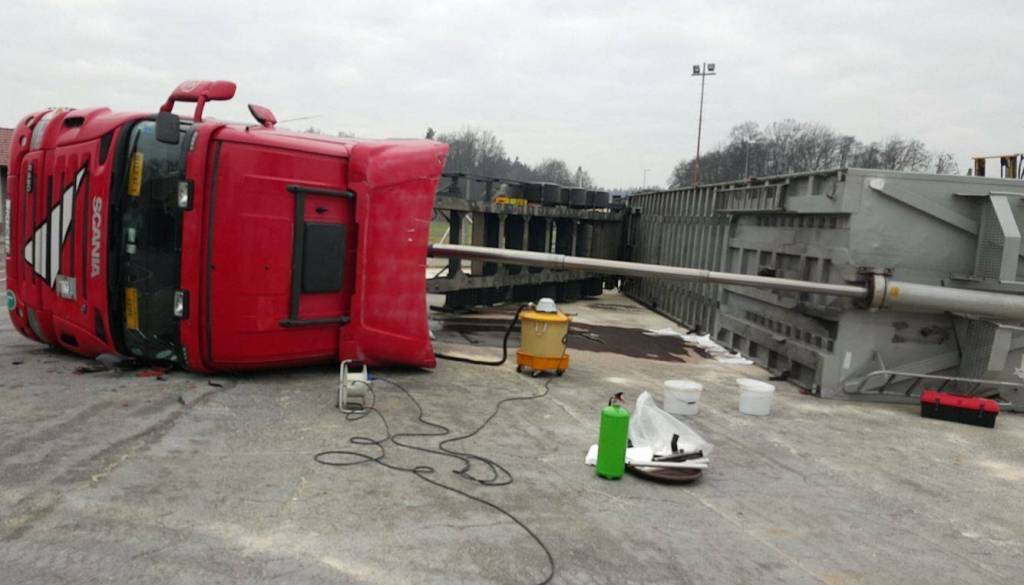 Do nesreče je prišlo pri raztovarjanju tovora - apnenca, ki ga kmetovalci uporabljajo za posipavanje njiv, iztekalo pa je tudi gorivo. Posredovali so gasilci PGD Gornja Radgona, ki so zavarovali okolje, ter olje in druge tekočine prečrpali v ustrezne posode. Sicer poškodovanih ni bilo, nastala je večja materialna škoda.