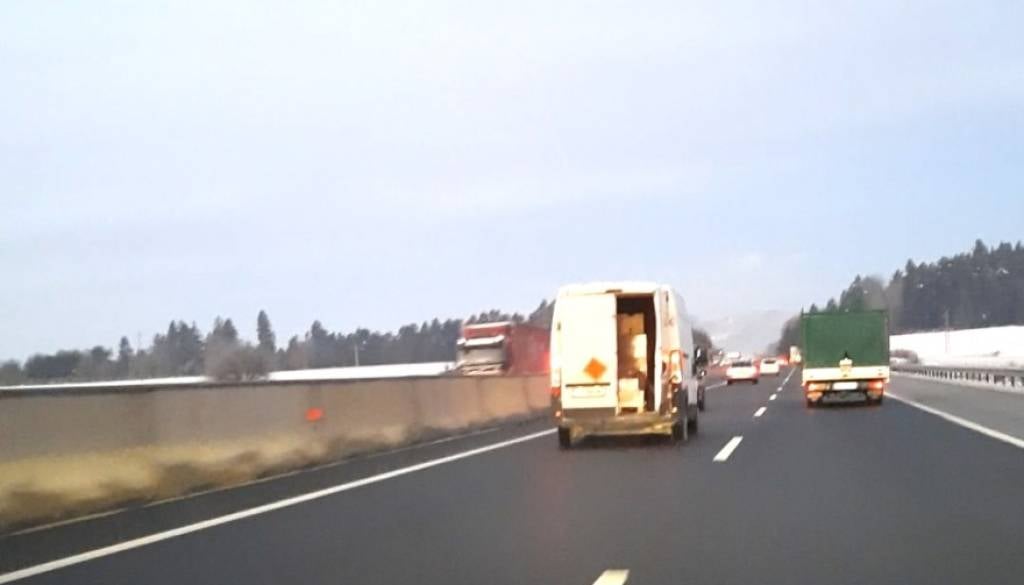 Policisti Postaje prometne policije Celje so včeraj zjutraj, med kontrolo cestnega prometa na avtocesti A1, med vožnjo iz smeri Arje vasi proti Šempetru opazili, da so se vozniku kombiniranega vozila, med vožnjo po prehitevalnem pasu, odprla vrata tovornega prostora.