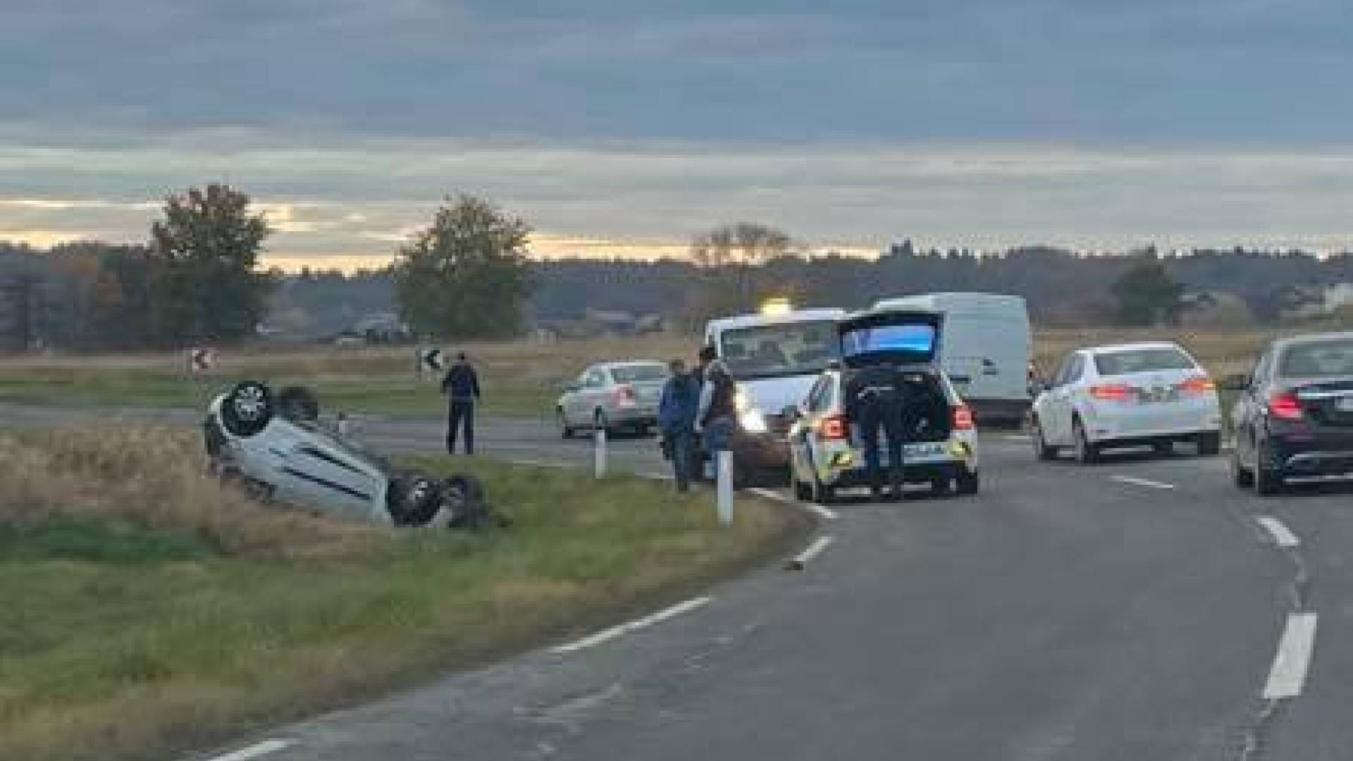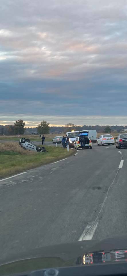 V ovinku je osebni avtomobil skrenil z vozišča in pristal na strehi.