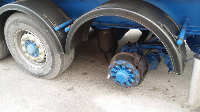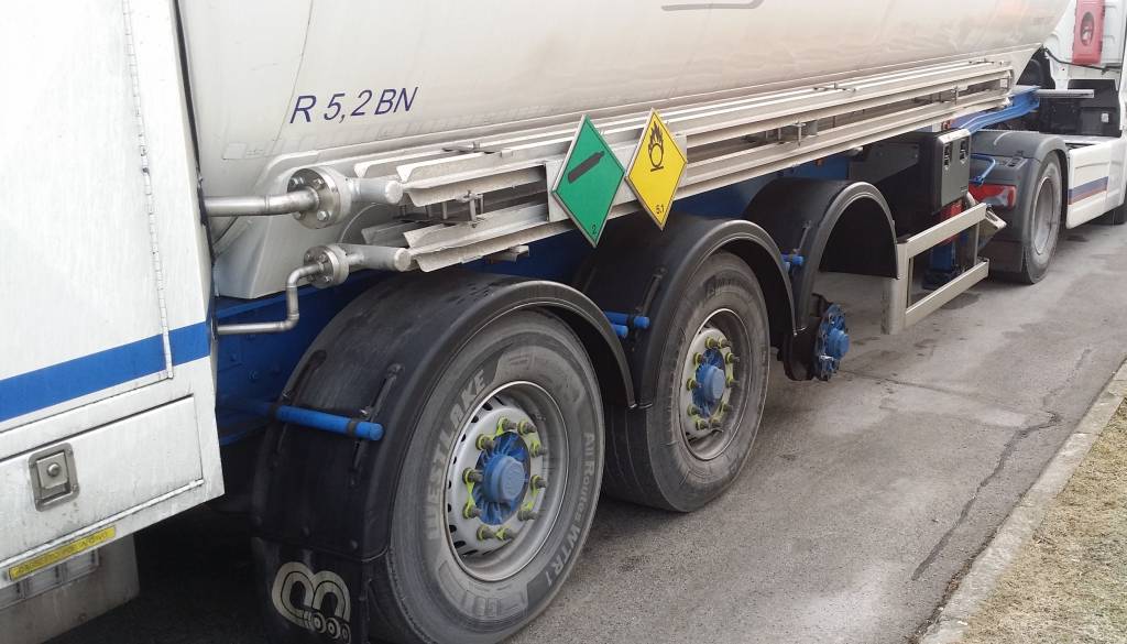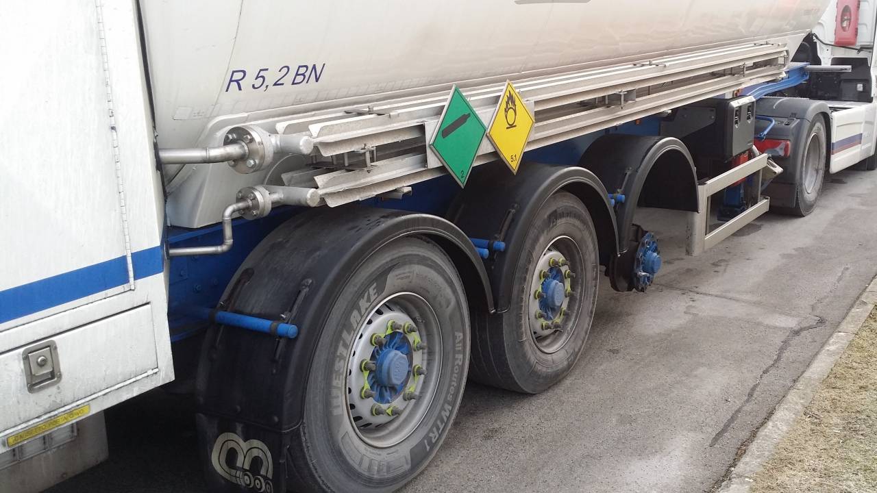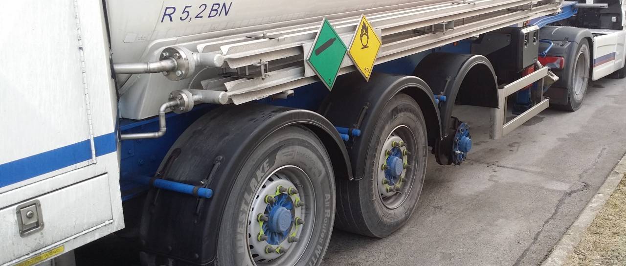 Voznik skupine vozil v sestavi vlečnega in priklopnega vozila nevarno blago prevažal brez enega kolesa na vozilu.