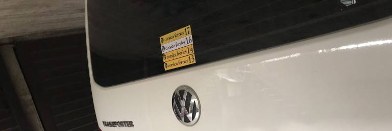 Vozilo ima na steklu pokrova prtljažnika nad znakom VW nalepljene štiri nalepke in na obeh prednjih blatnikih sta nalepki z napisom Posedi.