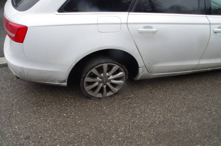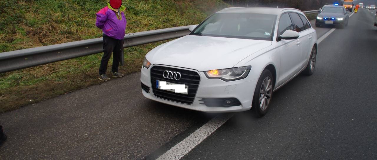 Pri tem je storil kar osem kršitev cestnoprometnih predpisov. Na avtocesti A1 izven naselja Vrhole je voznik audija na avtocesti ustavil. Vozniku se je med vožnjo izpraznila zadnja desna pnevmatika na vozilu, zato je zadnjih pet kilometrov pred ustavitvijo vozil zgolj po platišču zadnjega desnega kolesa.