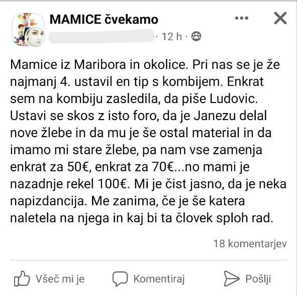 Na družbenih omrežjih se je pred dnevi pojavila objava, v kateri avtorica objave opozarja na moškega s kombijem, ki se ustavlja pred hišami na območju Maribora in ponuja zamenjavo žlebov.