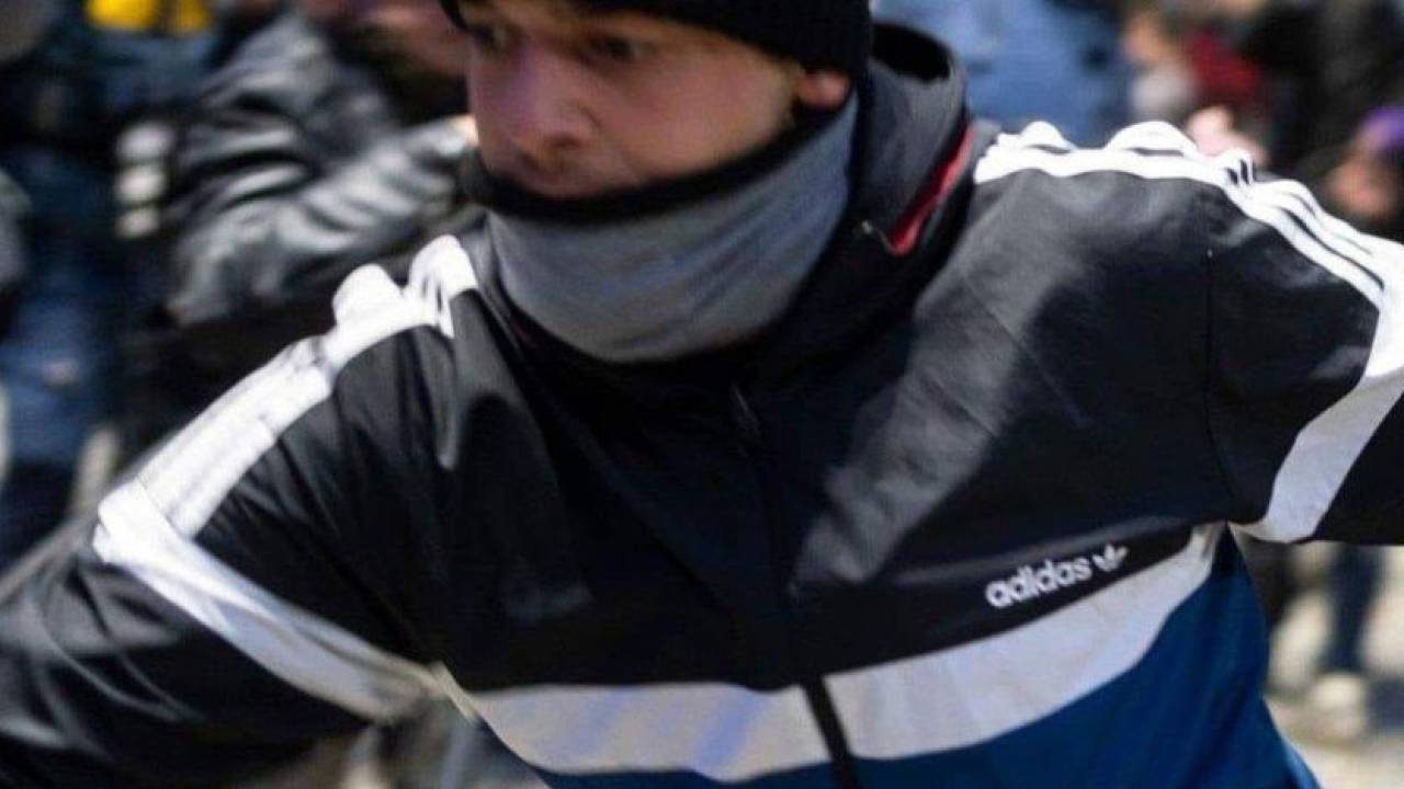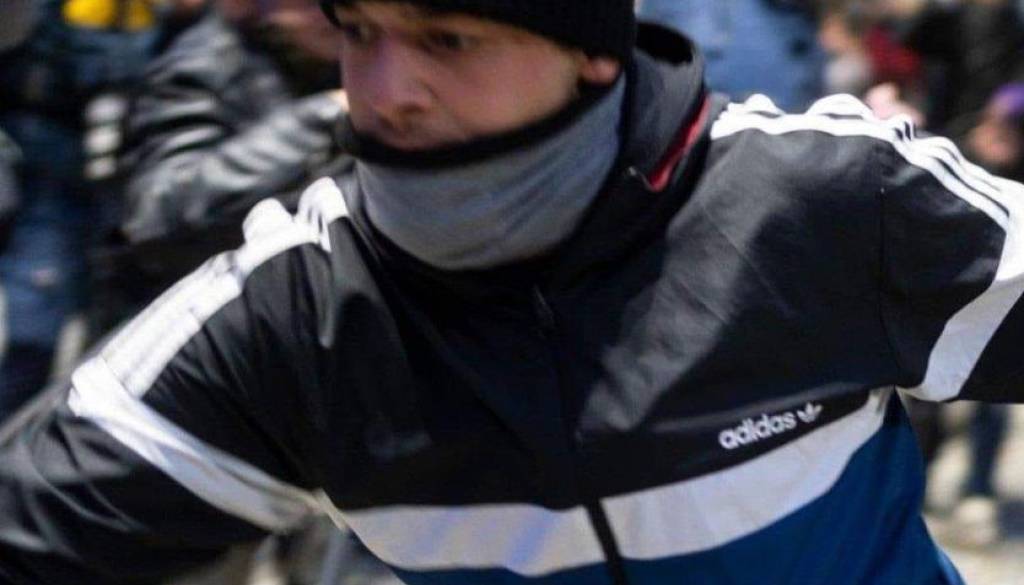 Kot vidimo iz slike gre za pripadnika ene izmed drzav juzneje od nas, ali po "domace" receno cefurja. O tem prica zgornji del trenirke firme Adidas in spodnjega dela trenirke, ki pripada firmi Nike. Predvidevam, da nosi bele copate znamke Adidas. Iz opisa lahko razberemo, da gre za hijeno oziroma strahopetca, ki se je spravil na policista, ko je ta imel opravka z drugim nasilnezem in tako nepokrit "hrbet". Nic nimam proti protestom, nekateri jo podpirajo drugi ne. Moti me pa, da zato uporabljajo nasilje in se izgovarjajo na proteste, poleg tega lahko resno poskodujejo zgradbo, drugega cloveka ali celo zival (policisti na konjih). Vsako tako dejanje je treba ustaviti, podati vse informacije, ki lahko pomagajo policistom prijeti zgoraj omenjenega osebka (smet, moram tako reci).