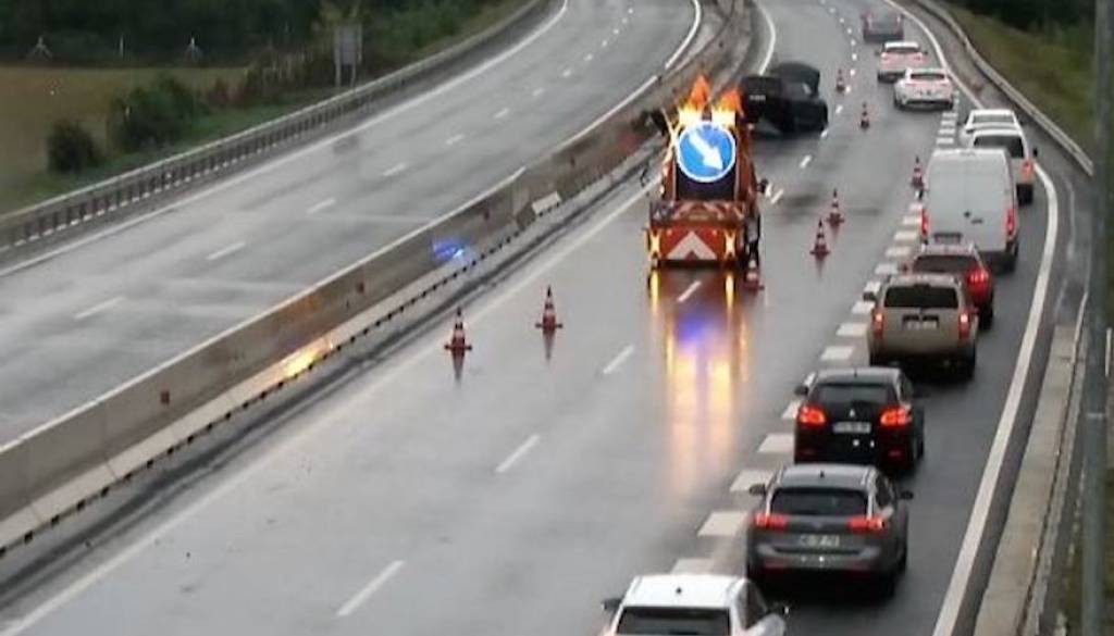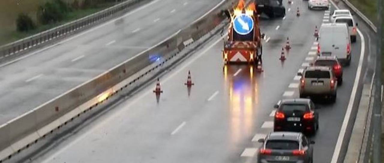 Zaprta sta vozni in prehitevalni pas, promet poteka po odstavnem pasu.