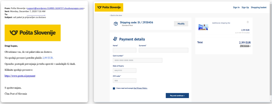 Za izvedbo lažnega plačila mora prejemnik klikniti na povezavo v sporočilu. Posameznik je v takšnem primeru preusmerjen na ponarejeno spletno stran, kjer je prav tako uporabljen logotip ene od dostavnih služb. Na spletni strani je zahtevano, da vnesete podatke o svoji plačilni kartici.