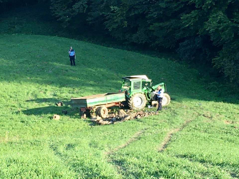 Na travniku se je prevrnil traktor