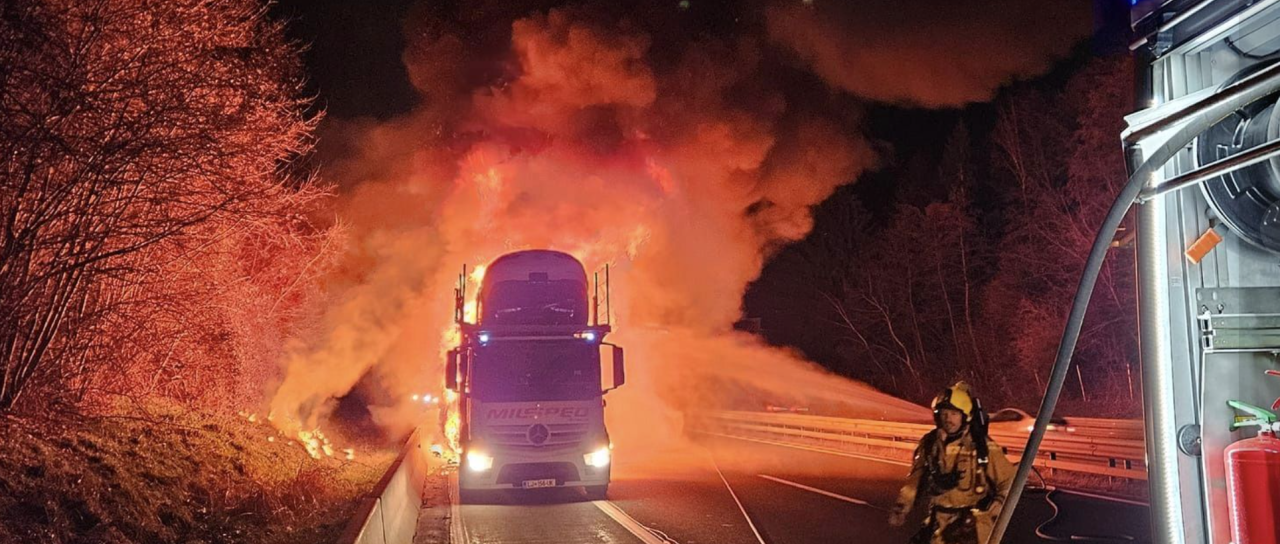 Sedaj pa je znanih več podrobnosti. Kot poroča Uprava Republike Slovenije za zaščito in reševanje, je na priklopniku tovornega vozila zagorelo električno vozilo.