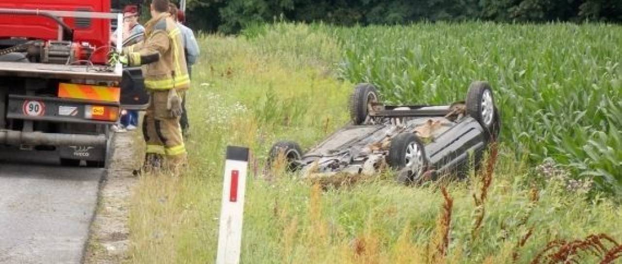 Zaradi poledenelega cestišča zapeljala v jarek in se prevrnila na streho.