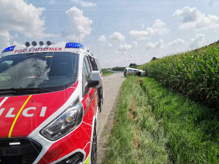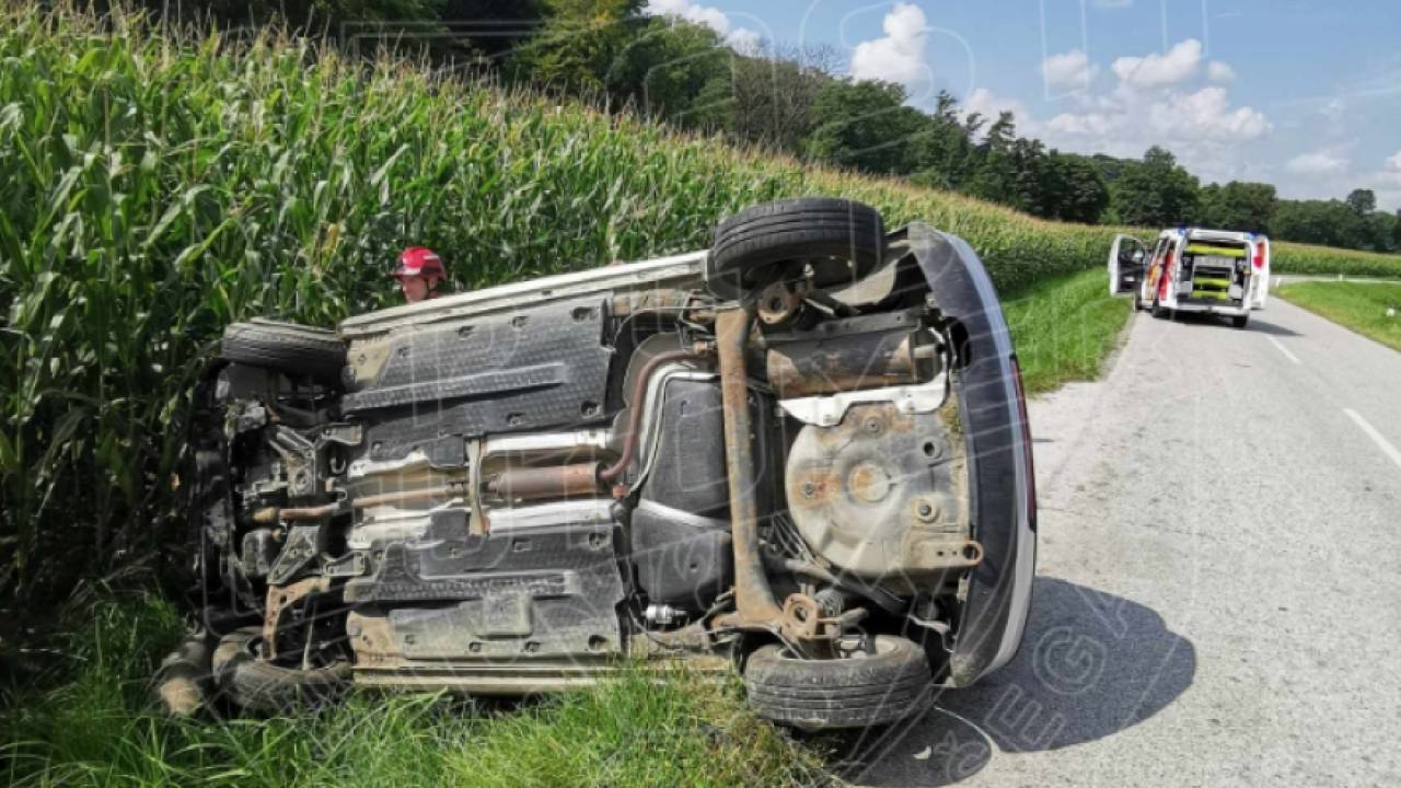 In sicer osebno vozilo je zdrsnilo s cestišča in se prevrnilo na streho.