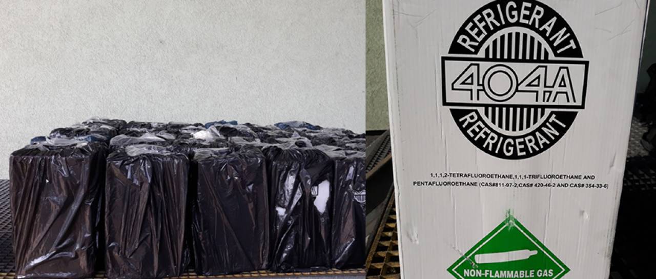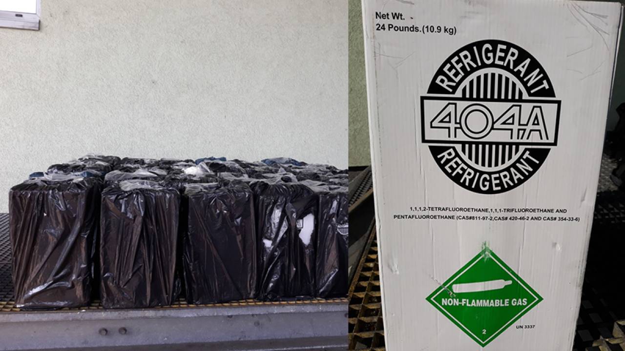 Pri pregledu tovorne prikolice so pod prtljago in paketi potnikov odkrili pakete, ovite s črno folijo, v katerih se je nahajalo 44 jeklenk s hladilnim plinom za klimatske naprave.