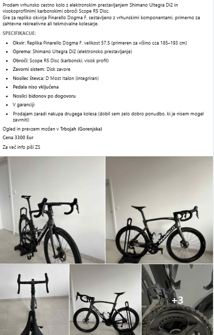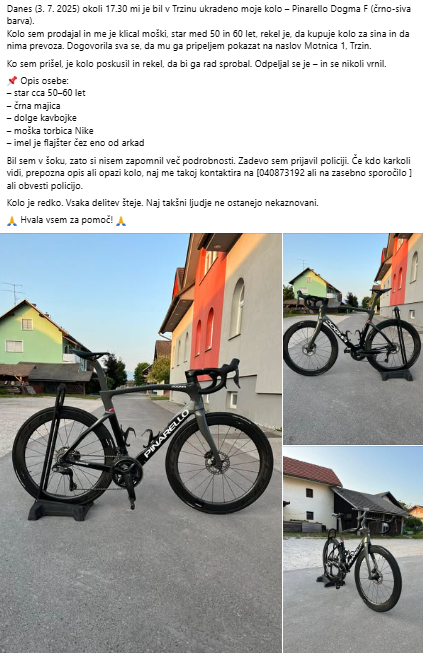 Oškodovanec je že 10. junija na spletu objavil oglas, v katerem je prodajal cestno kolo, sestavljeno na repliki okvirja Pinarello Dogma F, primerno za kolesarje višine od 185 do 193 cm.