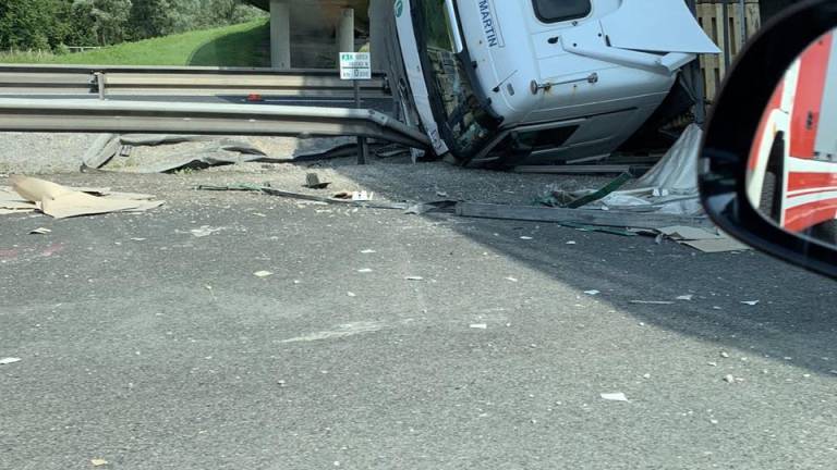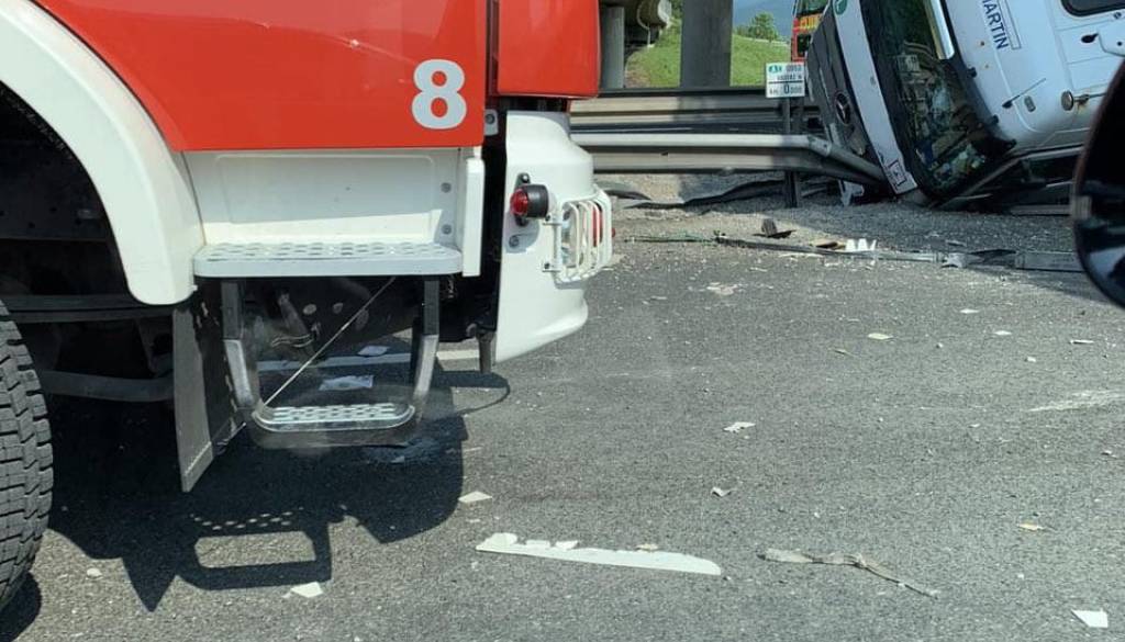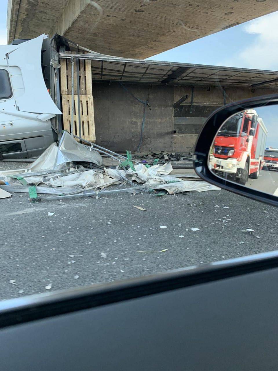 Po poročanju Uprave Republike Slovenije za zaščito in reševanje se je ob tem odpel natovorjen kolut pločevine, ki se je skotalil po cestišču in poškodoval dve osebni vozili.