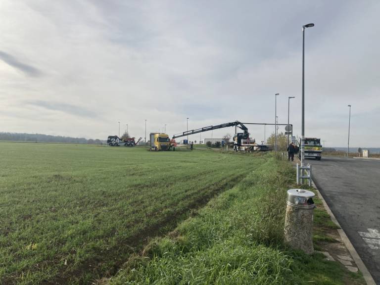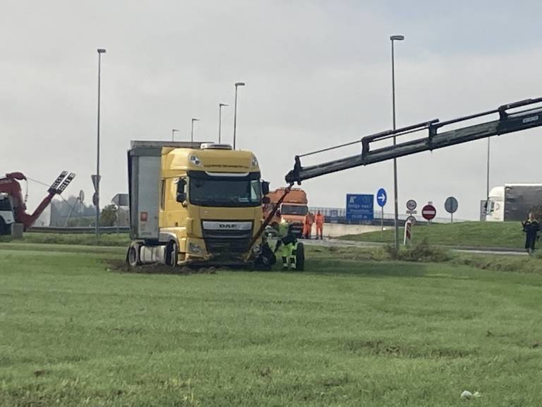 In sicer na pomurski avtocesti v smeri proti Madžarski je tovornjak, iz zaenkrat neznanega razloga, odletel s ceste.