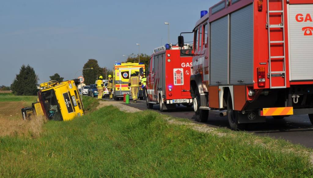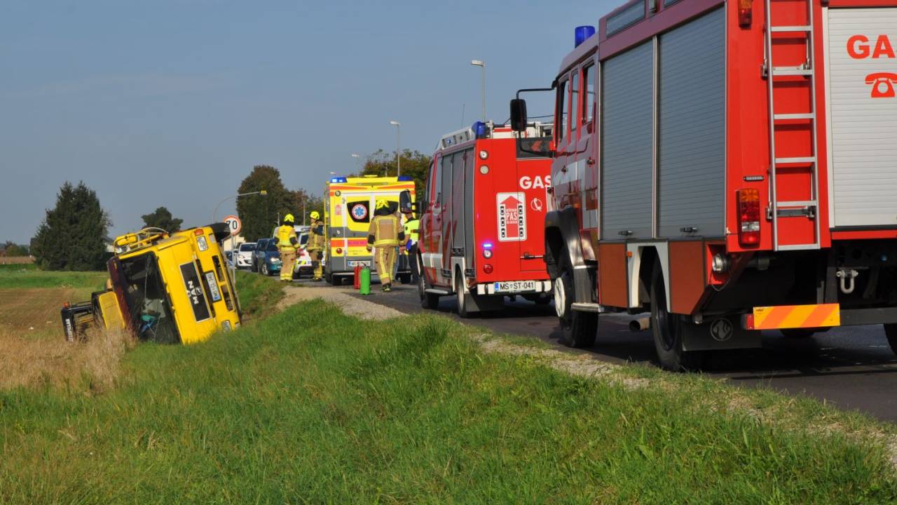 Tovorno vozilo je zdrsnilo s cestišča in se prevrnilo v obcestni jarek.