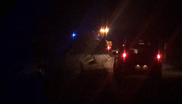 Tovornjak, ki je prevažal manjši bager, je zdrsnil s cestišča in se prevrnil v obcestni jarek, kjer je obtičal na boku. Neuradno naj bi prometni nesreči botrovala vožnja po bankini.