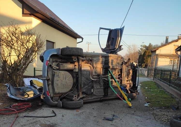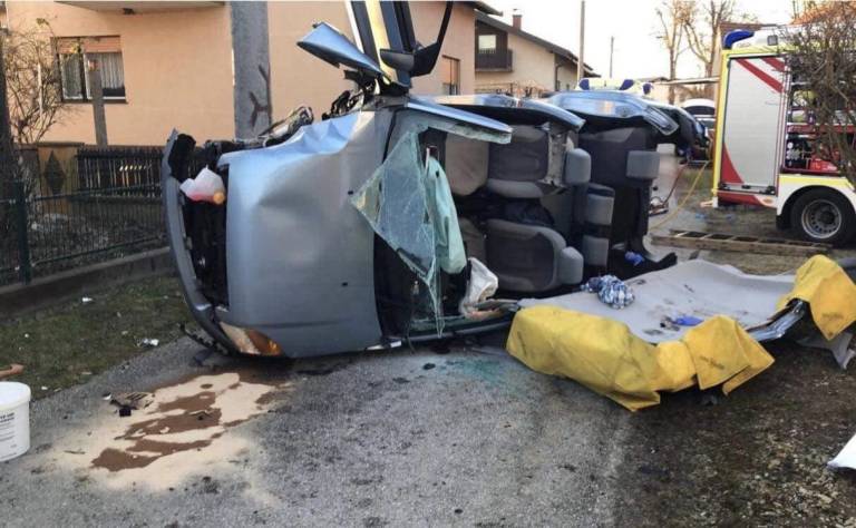 Voznik osebnega avtomobila, ki je bil v vozilu sam, je trčil v drog električne napeljave, kjer je vozilo obstalo na boku.