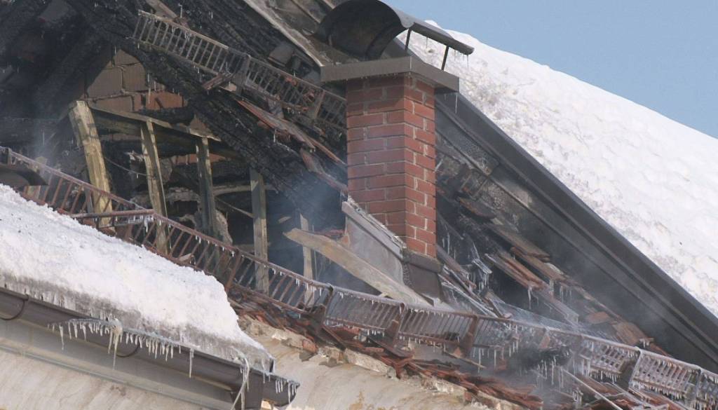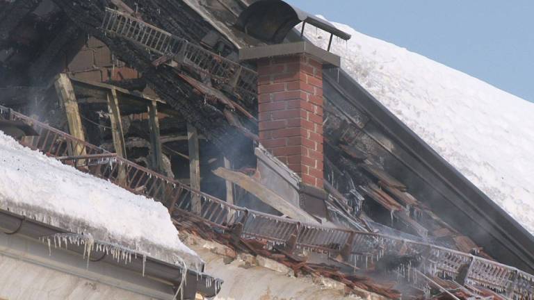 Na lesenih tramovih, kjer je ponoči divjal požar, so danes ledene sveče. Uničenih in zdaj že v ledenem oklepu je sedem stanovanj. Brez strehe nad glavo je ostalo dvanajst ljudi. Zakaj je zagorelo še vedo ne vedo.