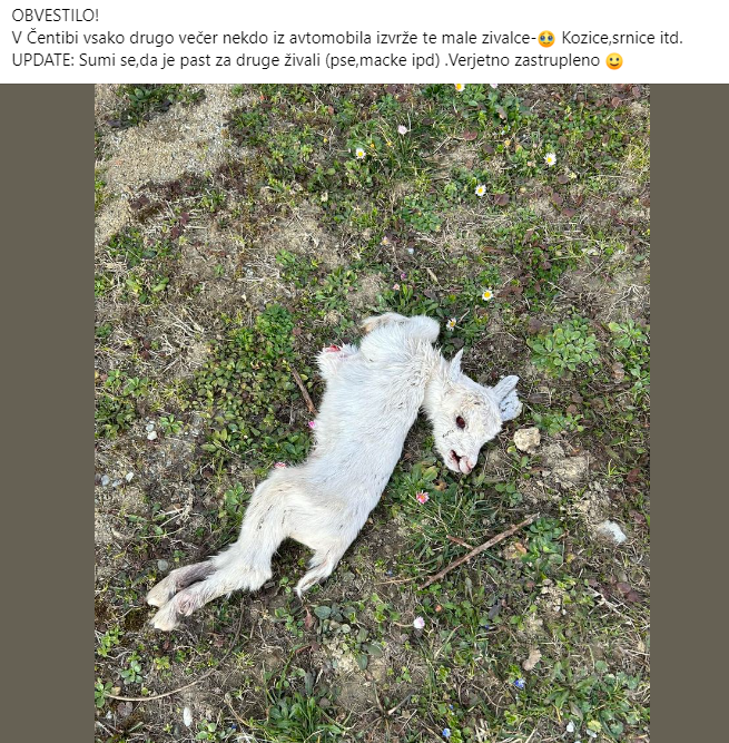 »V Čentibi vsako drugo večer nekdo iz avtomobila izvrže te male živalice, kozice, srnice in podobno. Sumi se, da je past za druge živali, na primer pse in mačke. Verjetno zastrupljeno,« opozarja eden izmed uporabnikov.